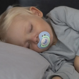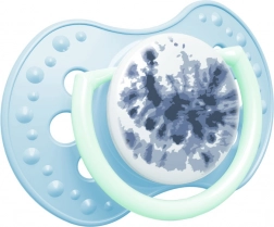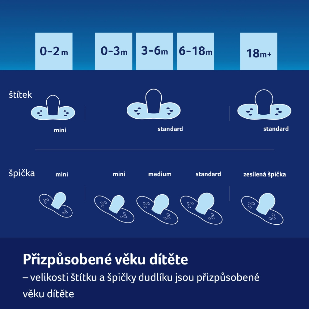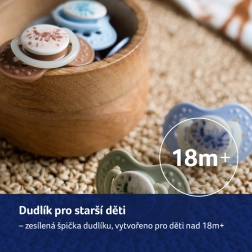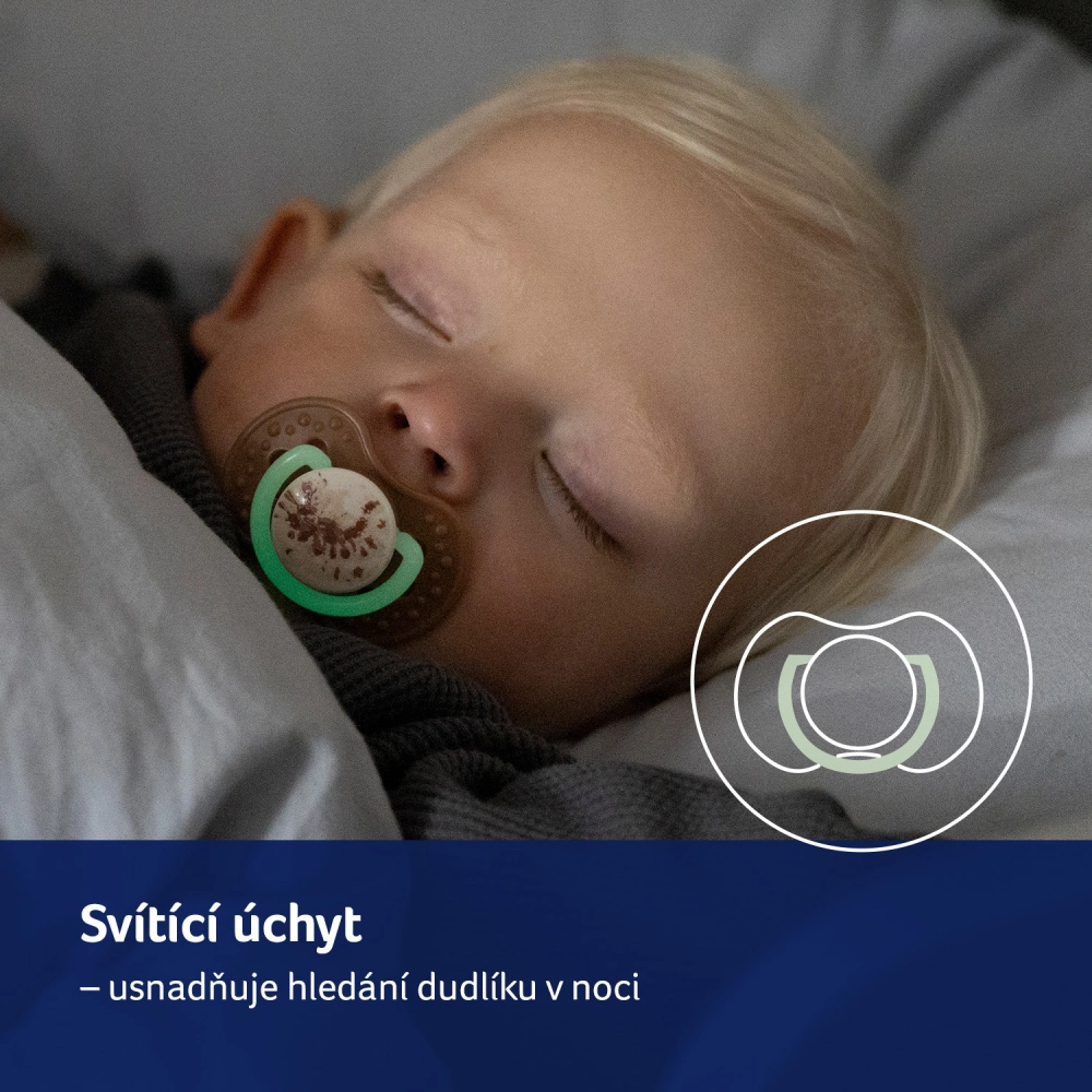 Til større børn (18m+) er sutten udstyret med en forstærket silikonespids, der er mere modstandsdygtig over for bid. Selvlysende ring sikrer hurtig lokalisering i nattemørke. Materialerne er BPA-fri, smags- og lugtneutrale, velegnet til sensitive babyer. Der medfølger et praktisk etui til hygiejnisk opbevaring.