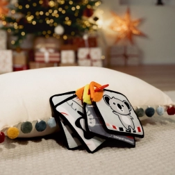 Opdag det ideelle første legetøj til babyer 0m+. Sæt med 4 dobbeltsidede stofkort (12 × 12 cm) i høj kontrast hjælper barnet med at fokusere og udvikler hånd-øje-koordination. Hvert kort er blødt, knitrende og behageligt at røre ved, så det fanger selv de mindstes opmærksomhed.