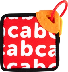 Der medfølger en fleksibel bidering i hvert hjørne til massage af gummerne og lindring under tandfrembrud. En plastikring gør det nemt at fastgøre på tremmeseng, barnevogn, gynge eller autostol – ideel både hjemme og på farten.