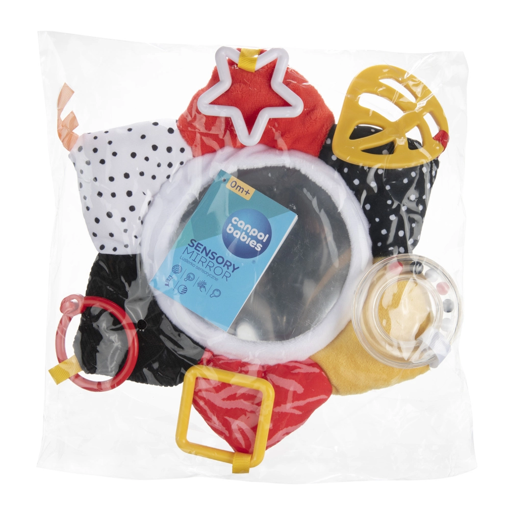 Sjov og udviklende legetøj til de allermindste: blødt sansemotorisk spejl CANPOL babies fra BabiesBoo-kollektionen med kontrastfarver, sikkert spejl, knitrende elementer, bidering og rangle. Takket være den praktiske ring kan den nemt fastgøres til klapvogn, tremmeseng eller autostol og støtter udvikling af syn, hørelse, berøring samt finmotorik fra 0 m+.