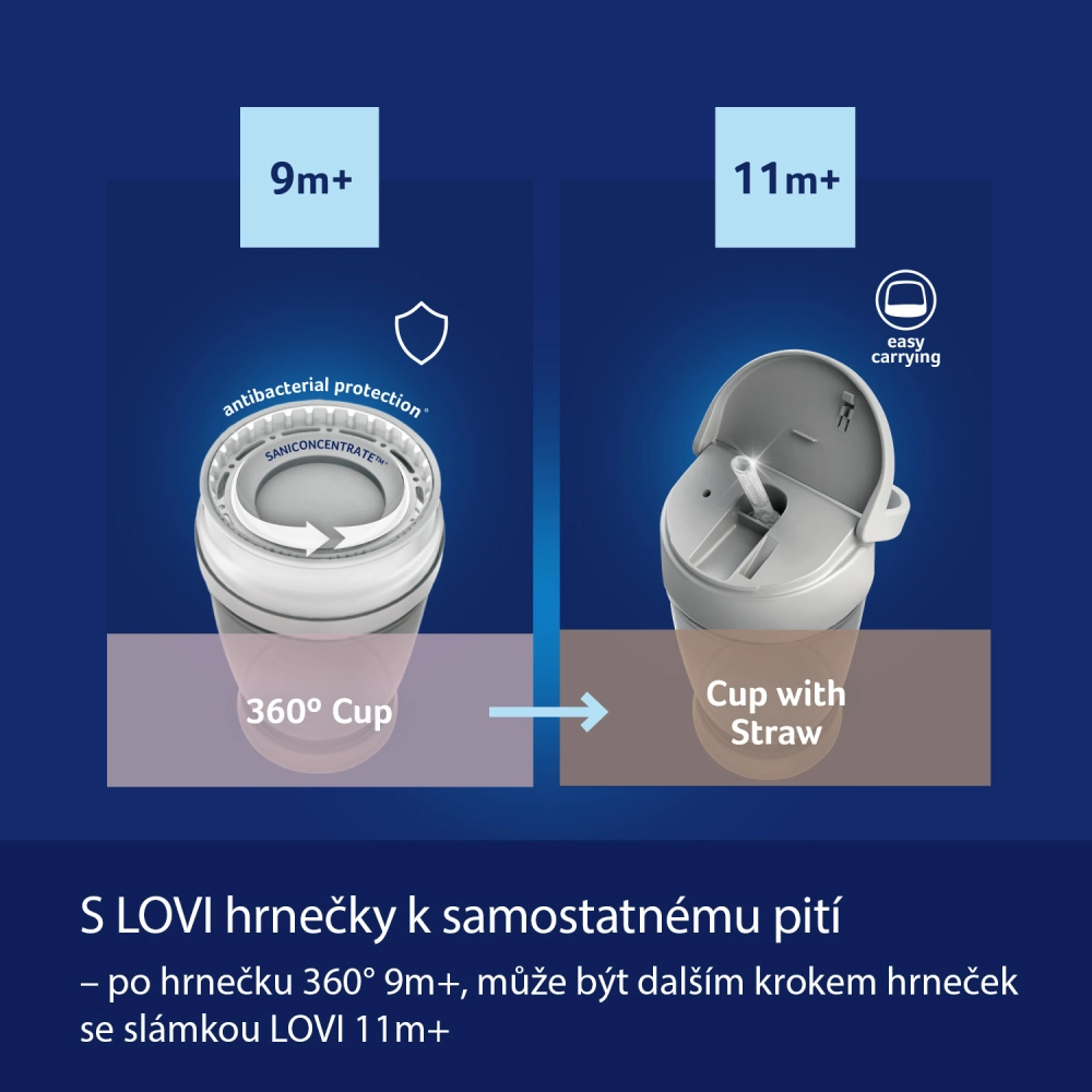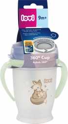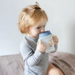Lovi 360° Night & Day kop er et glimrende skridt fra flaske til almindelig kop. Barnet drikker på en naturlig måde som fra et glas, men uden unødigt spild. Den bløde, tætte kant gør det muligt at suge væske fra enhver position langs kanten, hvilket støtter korrekte drikkevaner.