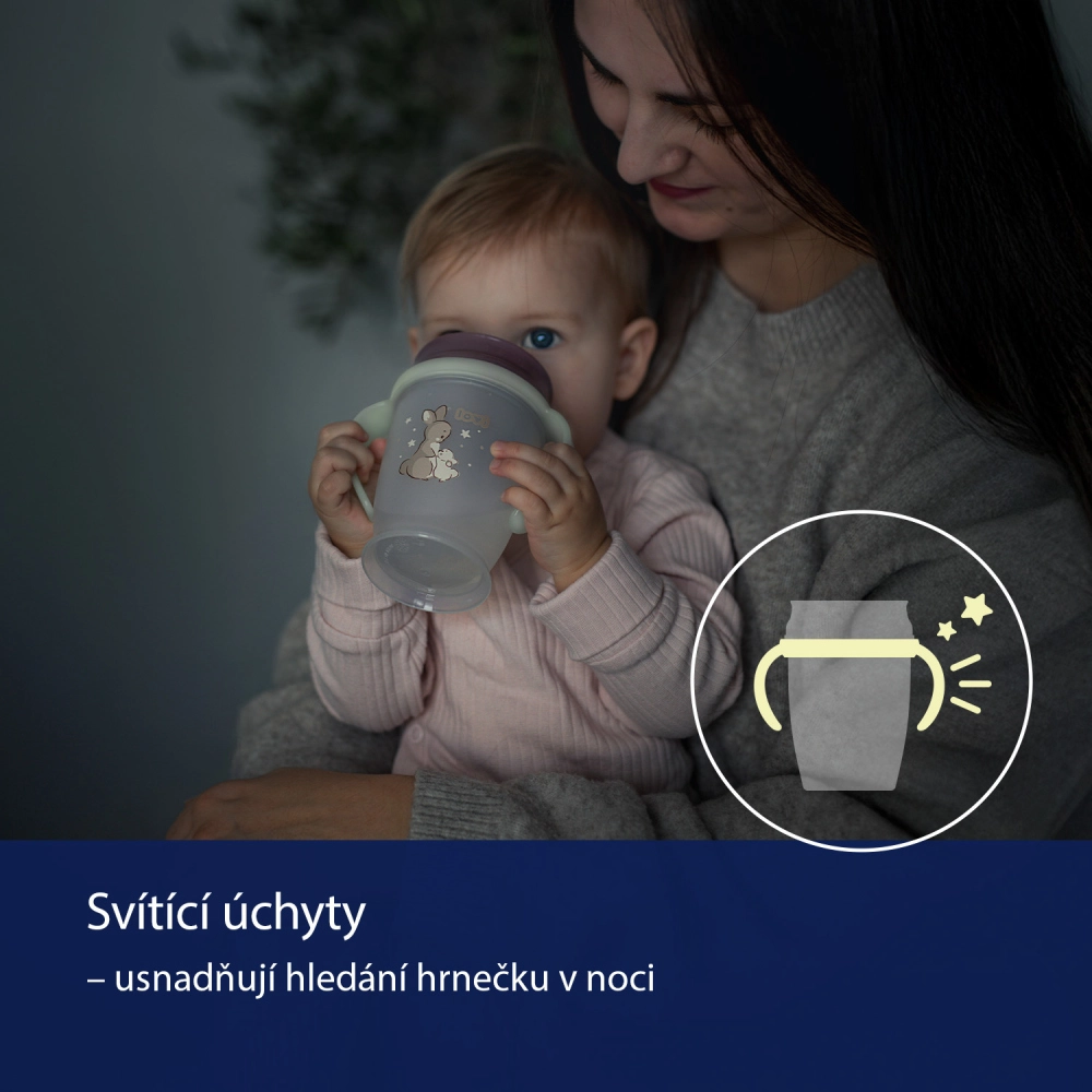 Ergonomiske håndtag lyser i mørke og passer perfekt i små børnehænder, så både barn og forælder nemt kan finde koppen når som helst.