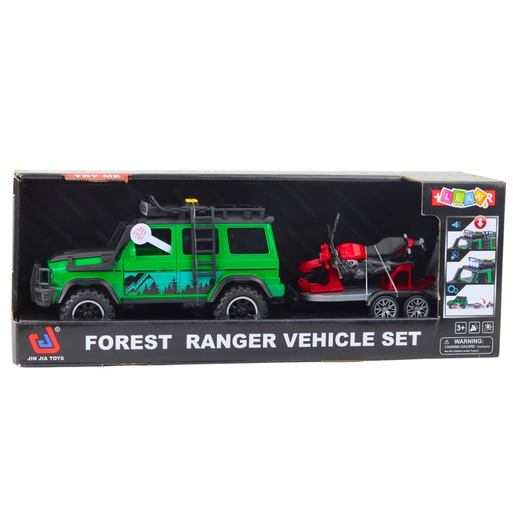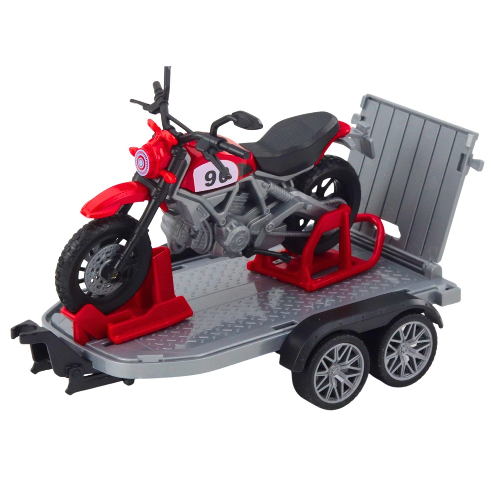 Sættet inkluderer en aftagelig to-akslet trailer med læsserampe og en detaljeret motorcykel. Hver del kan bruges hver for sig eller sammen – bilen, traileren og motorcyklen understøtter udviklingen af fantasi, koordination og selvstændig leg.