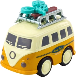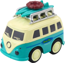 Oplev sjov på fire hjul med en charmerende camper inspireret af klassiske turistbusser. Takket være friktionsdrev suser køretøjet af sted efter et let skub, og den bevægelige tagbagage giver ekstra dynamik. Den kompakte størrelse passer i rygsækken, så barnet kan leve sine rejseeventyr ud hvor som helst.