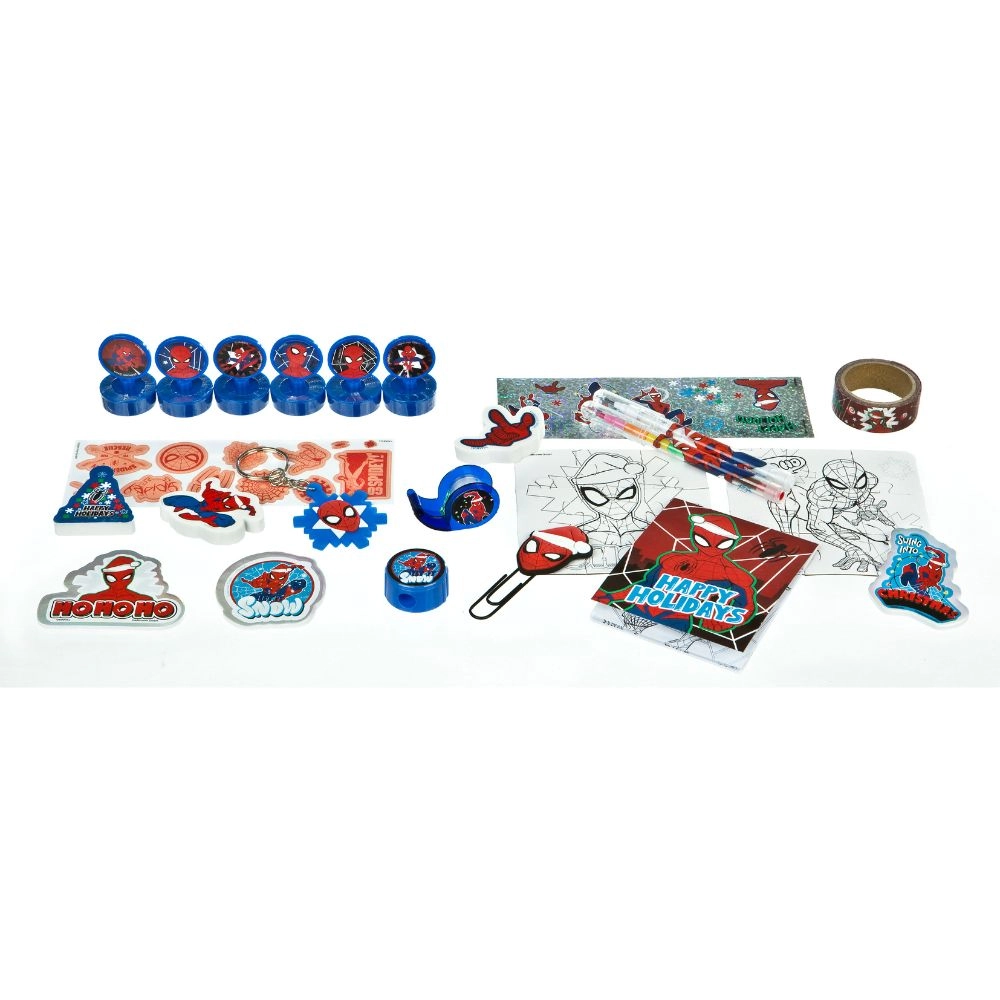 Indeni venter småting som mini-stempler, puslespil, nøglering, tape med dispenser, laserklistermærker, mini-blyant, mini-farveblyant, ryste-klistermærker, papirclips, notesblok, formede viskelædere og washi-tape. Hver låge er et lille eventyr og vil glæde alle SPIDER-MAN-fans.