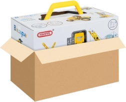- Klodser og konstruktionsdele, tilbehør, værktøj, opbevaringsboks, idébog med mønstre, vejledning, farverig gaveæske, transportkarton