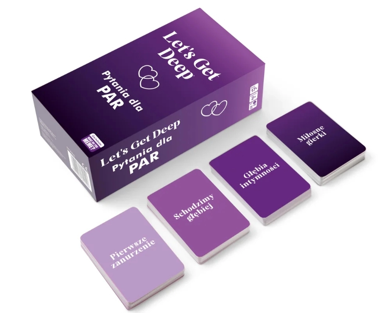 Spillet Let's Get Deep er det ideelle valg for par, der vil krydre tiden sammen og samtidig lære hinanden bedre at kende. Kortene er inddelt i fire kategorier – Første dyk, Dybere ned, Intimitetens dybde og Kærlighedslege – og guider jer gradvist fra lette emner til mere intime spørgsmål.