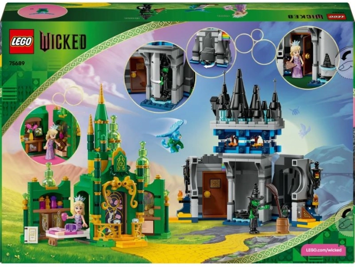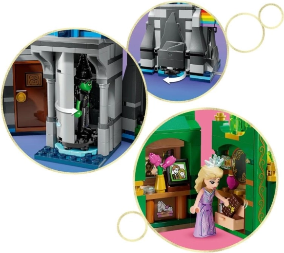 Udforsk ikoniske WICKED-lokationer i én æske: den elegante Smaragdby med stilfuldt værelse og skjult kort over landet Oz samt det mørke slot Kiamo Ko med roterende mekanisme og hemmeligt skjulested til Elphaba. En regnbuebro af klodser lader børn fortælle deres egne historier og udstille sættet som et designet interiørelement.