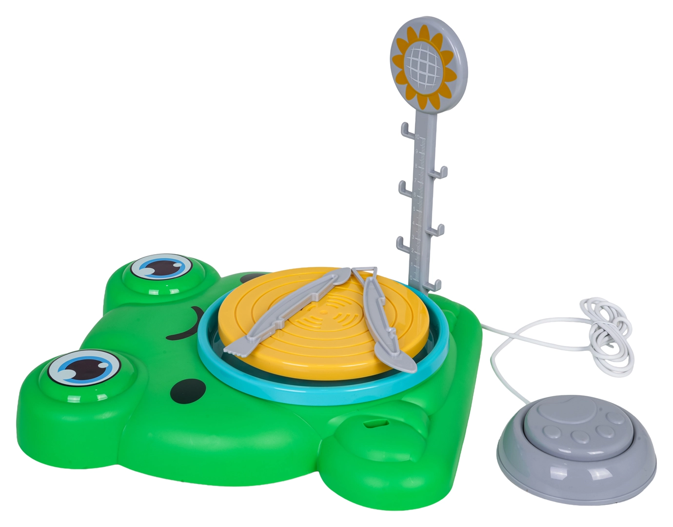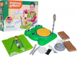 Den legesyge frø-drejeskive med fodpedal giver børn en sikker og sjov måde at prøve keramik på. Skiven roterer i to hastigheder (langsom/hurtig), så børnene nemt kan tilpasse arbejdstempoet. Når fadene er lavet, kan de males med de medfølgende farver og stolt udstilles.