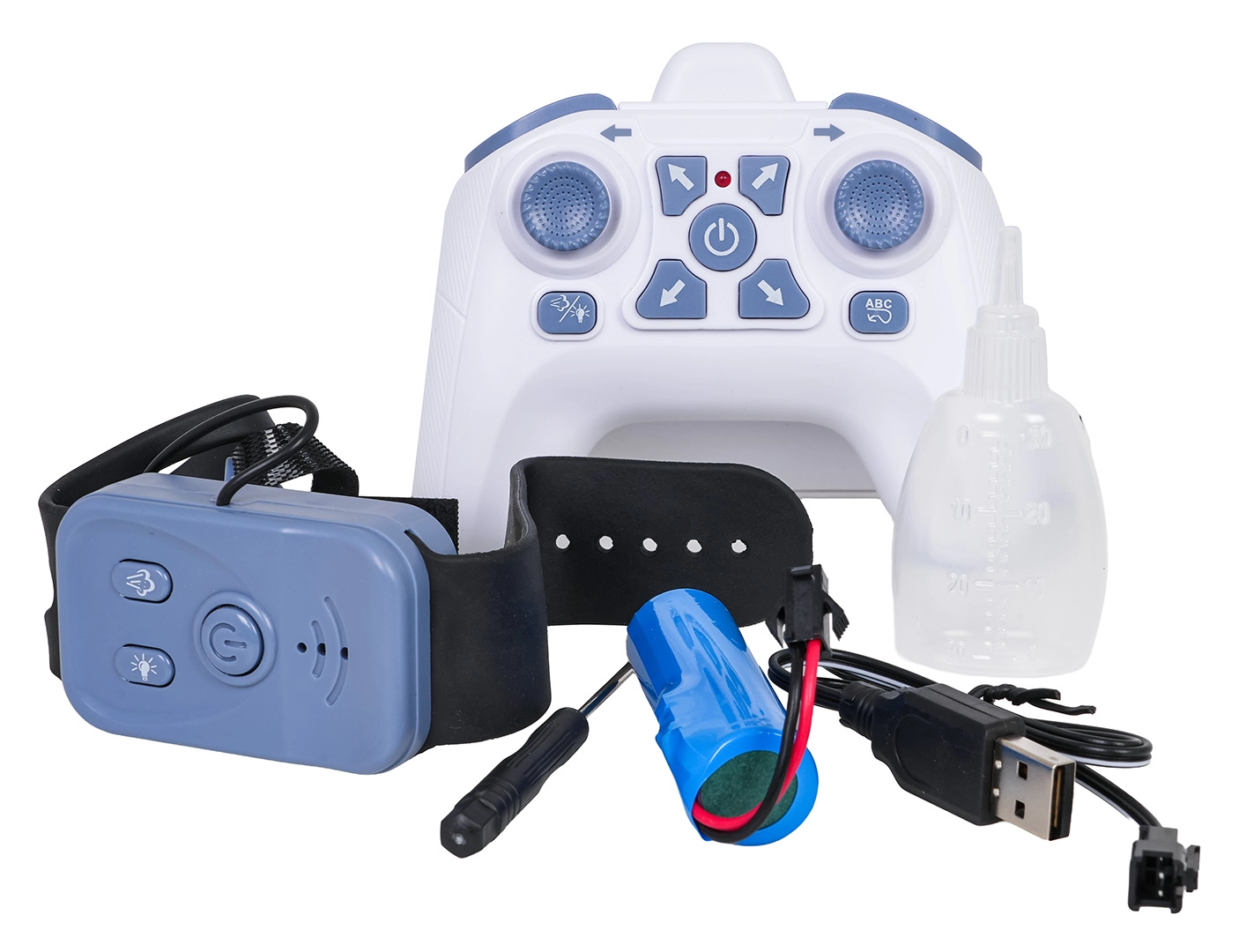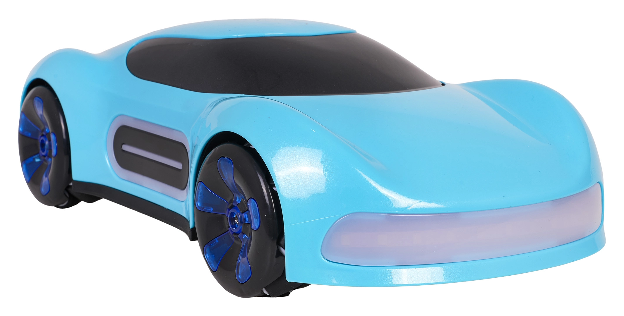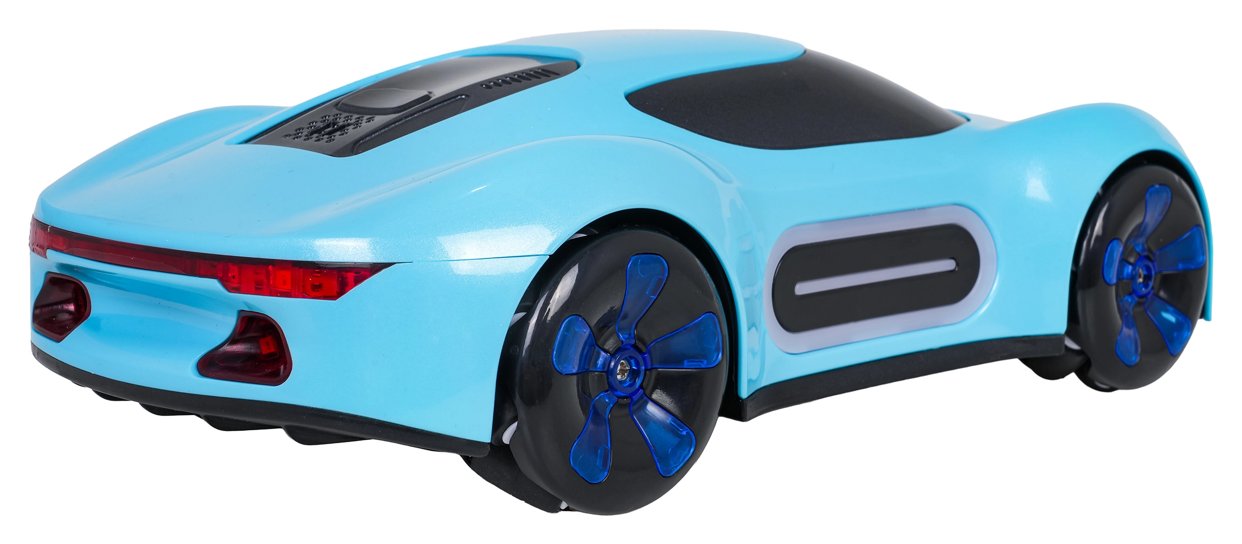 Bilen kan køre frem/tilbage, dreje højre/venstre, glide sidelæns, drifte og lave 360° rotationer. Betjeningen er intuitiv – vælg mellem manuel fjernbetjening eller gestik via uret. Medfølger gør et genopladeligt 3,7 V batteri og USB-kabel for nem opladning.