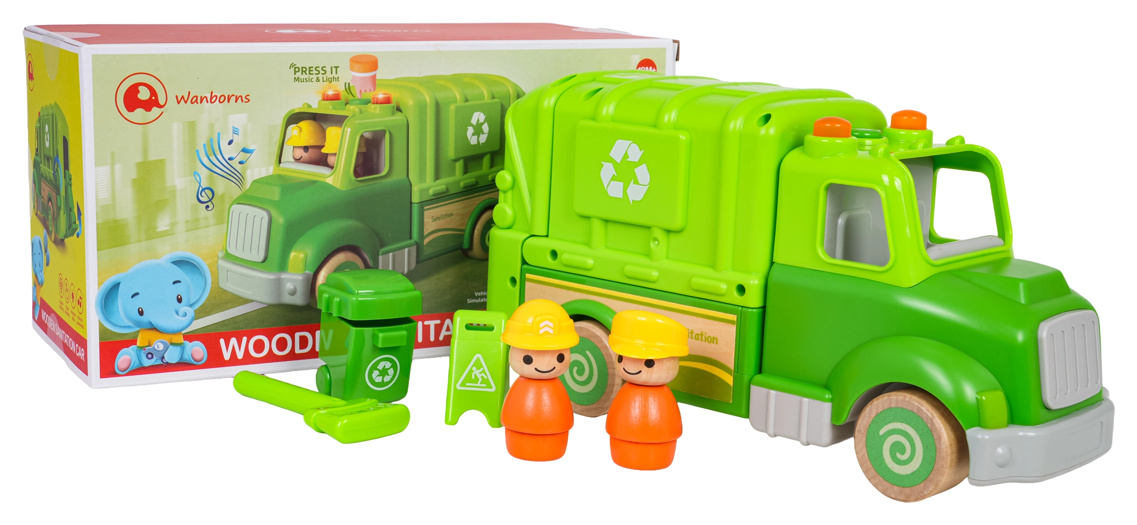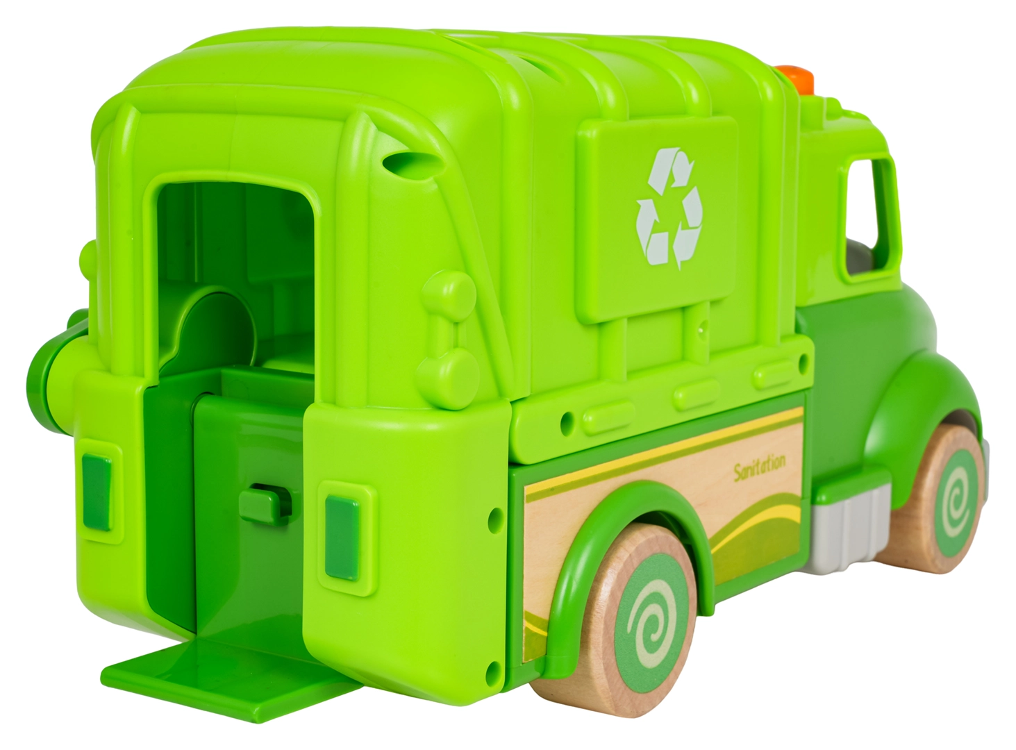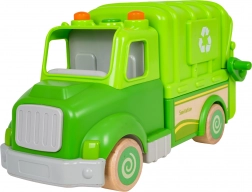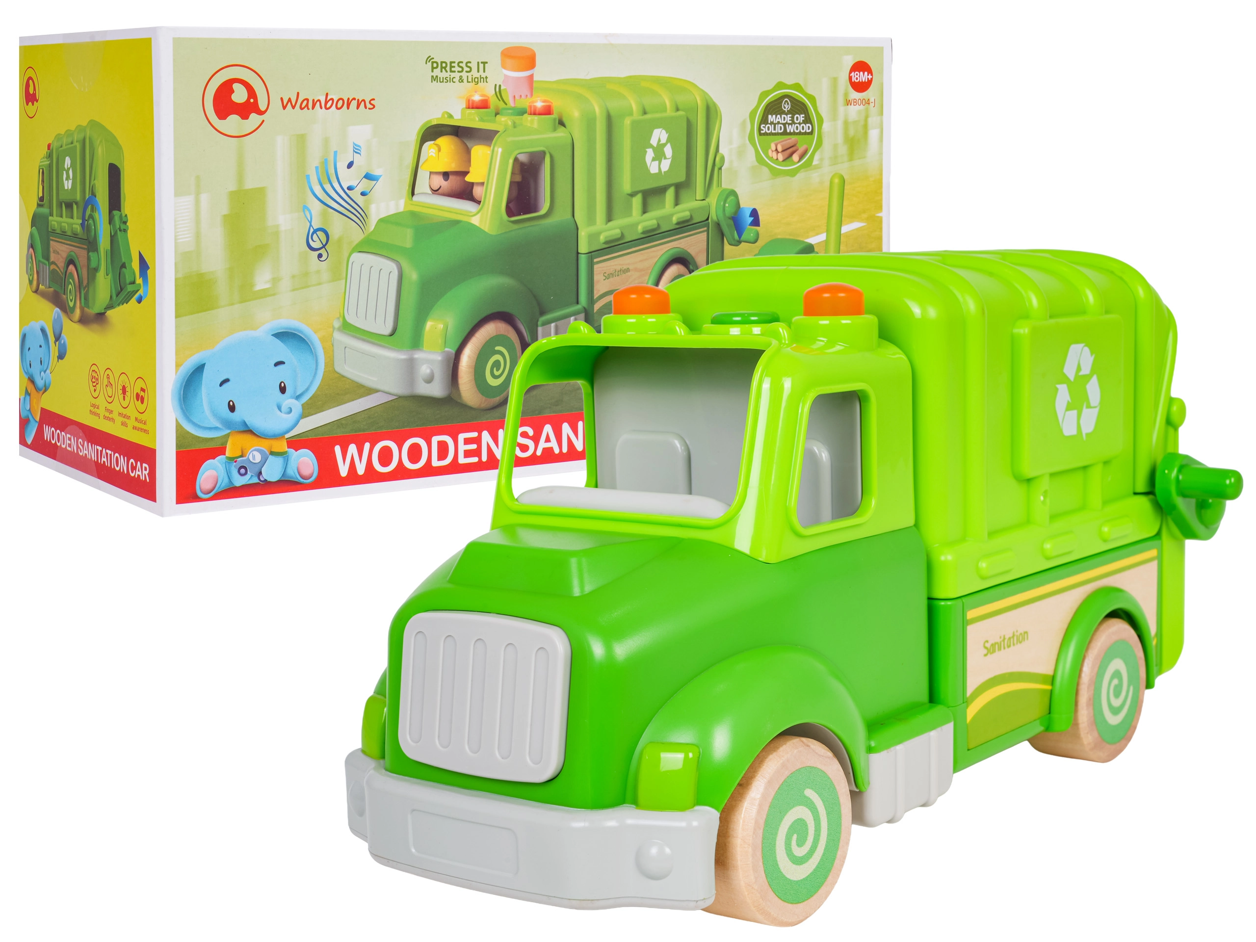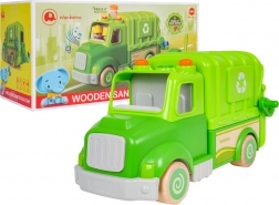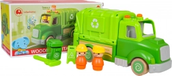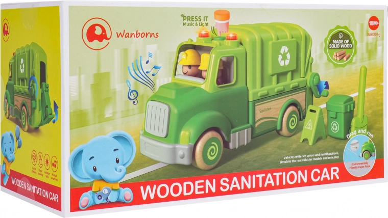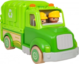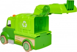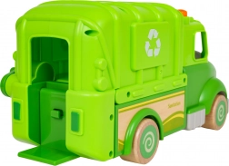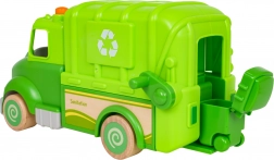 Denne grønne skraldebil er designet til sikker og kreativ leg. Afrundede former, træhjul og en robust konstruktion af træ og plast gør den til det ideelle legetøj for børn. På taget finder du en knap, der starter melodier, køre-, start- og hornlyde, suppleret af blinkende lys.