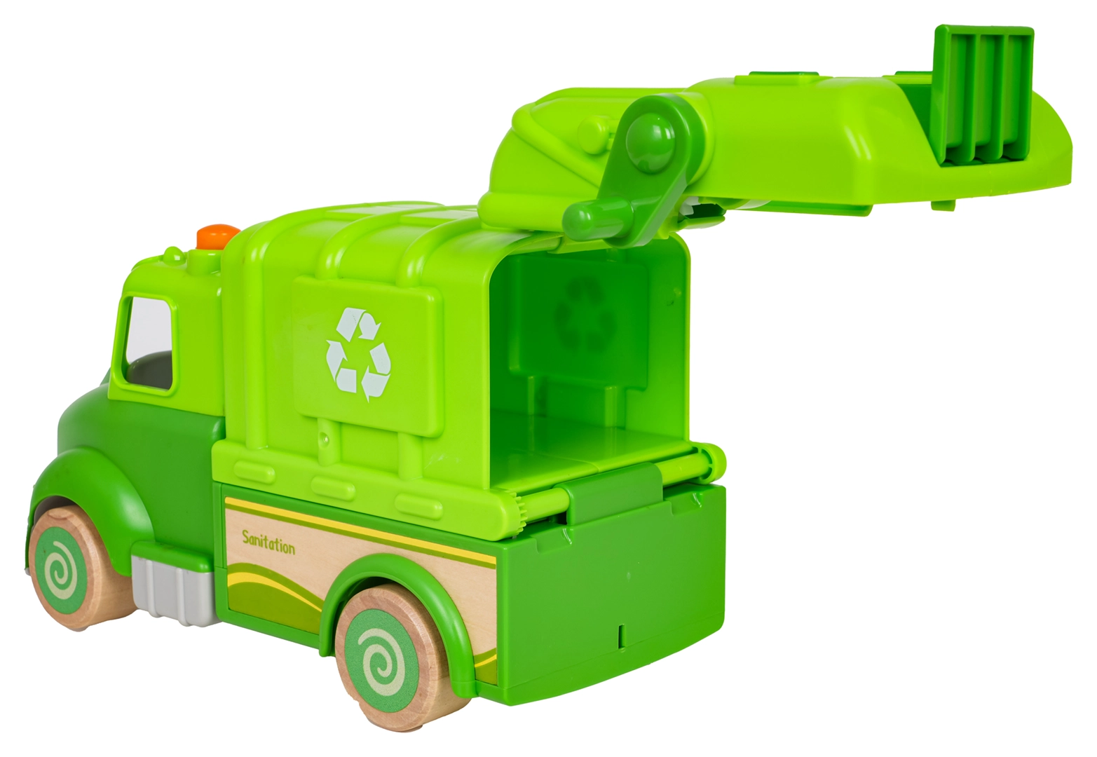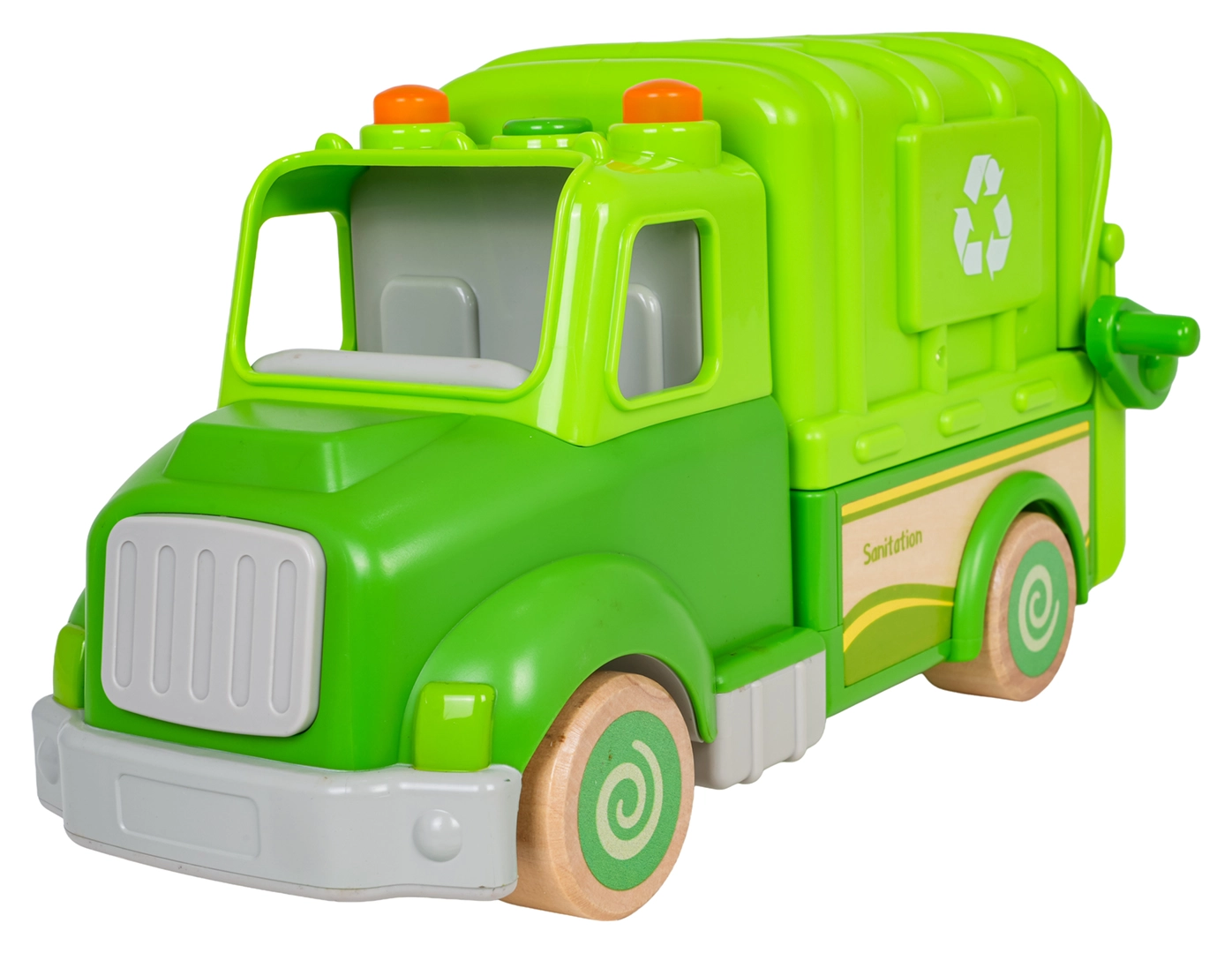 Børn vil elske den manuelle løftemekanisme til spanden, den åbnende og tipbare beholder samt muligheden for at “tømme” affald. I pakken er der en skraldespand, advarselsskilt, fejekost og to figurer, som udvider legescenarierne. Bilen har også øje til fastgørelse af snor, så den nemt kan trækkes.