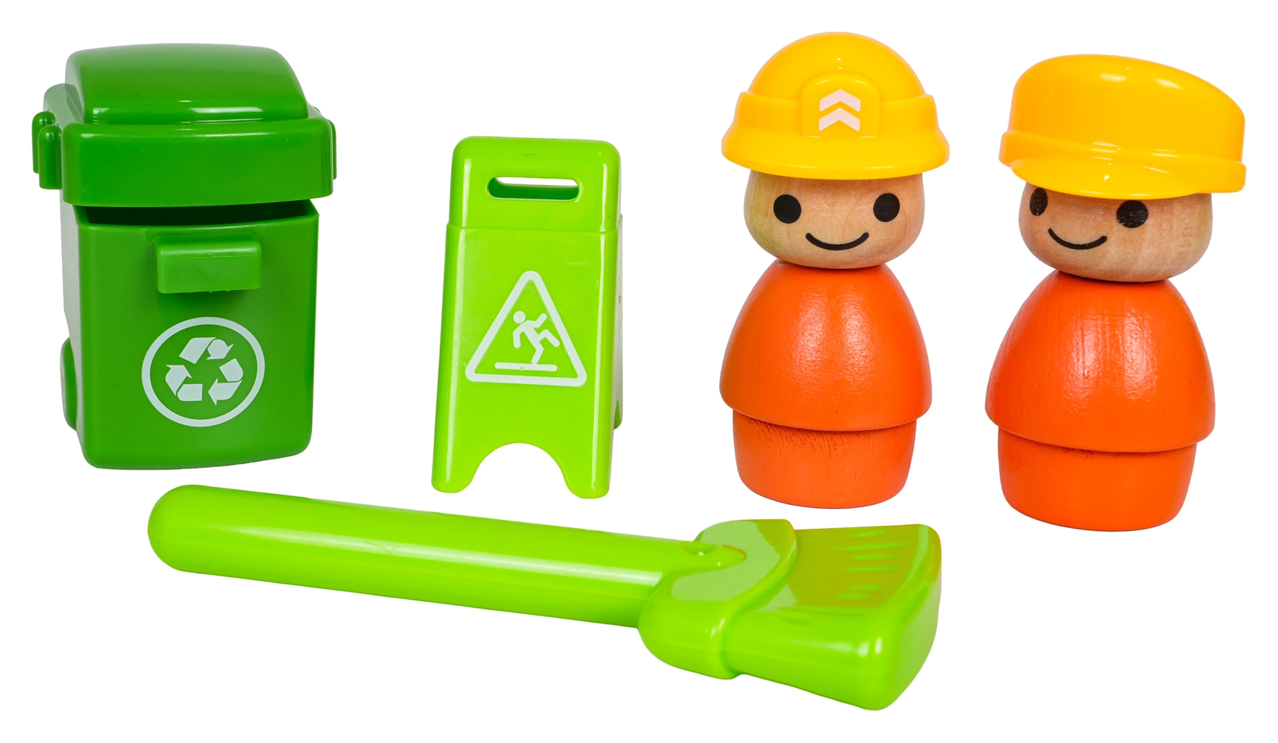Inkluderer 2 figurer, skraldespand, advarselsskilt og fejekost. Alt i sikker udførelse med klare farver.