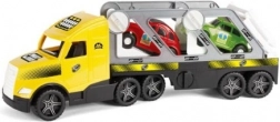 Opdag den store autotransporter Magic Truck Action med aftagelig trailer og to retro biler inspireret af modellerne VOLKSWAGEN Beetle og CITROEN 2CV. Legetøjet er lavet af holdbare og sikre materialer, tåler forskellige forhold og holder i mange år takket være den robuste konstruktion.
