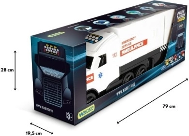 Stor børnelastbil MAGICKY TRUCK ACTION Ambulance med aftagelig container, skydedøre og støtteben. Holdbar, sikker, længde op til 81 cm.