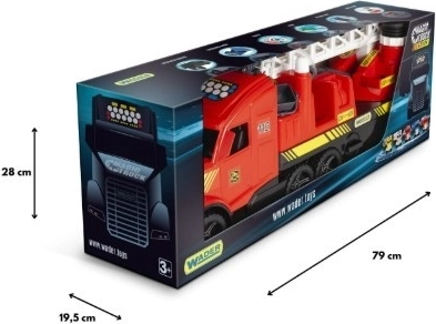 Den store brandbil fra serien Magic Truck Action vil glæde enhver lille helt. Den tilbyder en udtrækkelig og bevægelig stige med kurv, en funktionel pumpe og slange med vandtank, roterende elementer til at styre vandstrålen og en solid, holdbar konstruktion af sikre materialer. Traileren er styrbar og aftagelig og kan kobles på på to måder, i en længde på op til ca. 80 cm.
