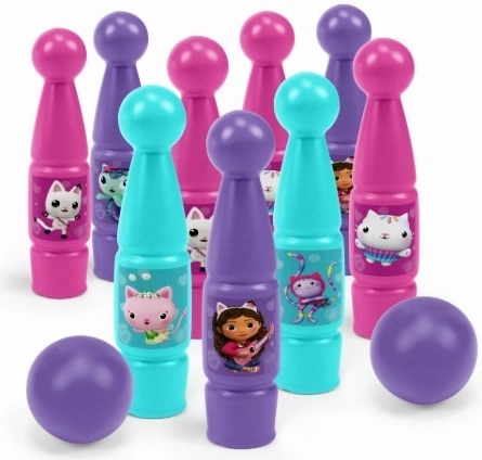 - Komplet sæt: 9 kegler (lyserøde, lilla, turkis), 2 bolde, klistermærkesæt med Gabi og kattevenner.