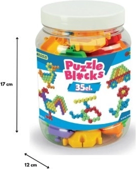 Farverigt byggelegetøj til børn af puslespilstypen med 35 dele i en praktisk genlukkelig krukke, som understøtter kreativitet, finmotorik og logisk tænkning. Delene forbindes let og gør det muligt at bygge dyr, køretøjer, bogstaver, tal samt rumlige og flade former af sikkert og holdbart materiale.