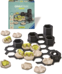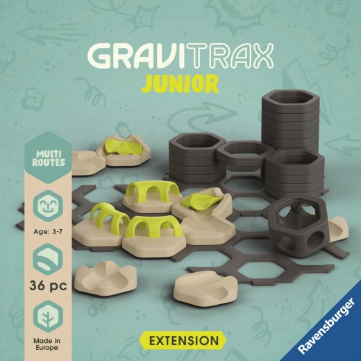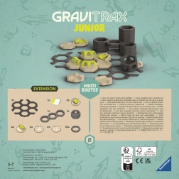 Udvidelsen giver flere muligheder for at føre kuglerne i forskellige retninger og skabe snoede ruter fulde af overraskelser. Den er ideel til at udvide eksisterende GraviTrax Junior-sæt og understøtter kreativ og selvstændig leg for børn fra 3 år.