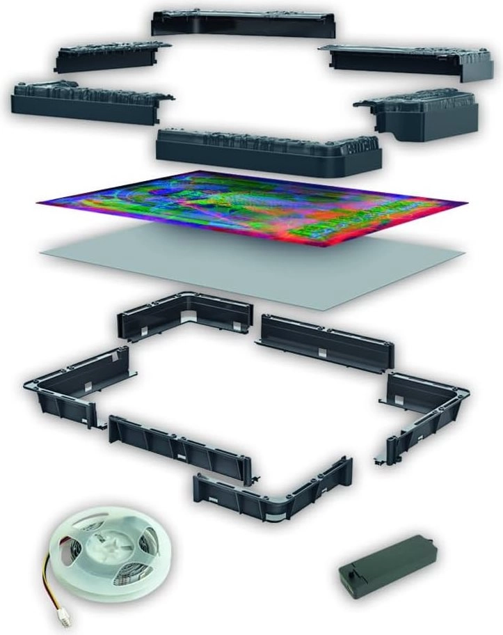 - Puslespil, kraftig karton, lim, monteringsramme i plast, elektronisk modul, RGB LED-stribe, referenceplakat, brugsvejledning