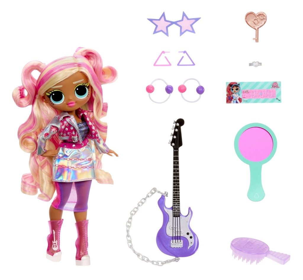 Dukken har et detaljeret outfit, leddelte lemmer til posering og masser af tilbehør, inklusive elektrisk guitar, smykker og børste. To looks i ét og mere end 15 overraskelser giver timevis af kreativ leg, samling og udstilling.