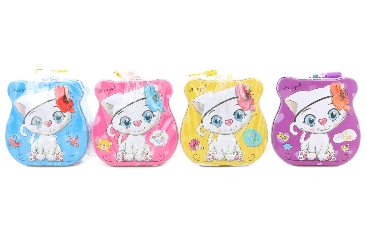 Denne stilfulde sparebøsse i metal med kattemotiv er et skønt tilbehør til både hjem og kontor. Takket være nøglelås vil dine mønter og sedler altid være i sikkerhed. De kompakte mål gør den nem at placere på en hylde, et bord eller i en skuffe.