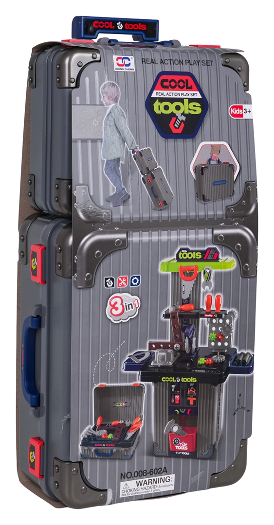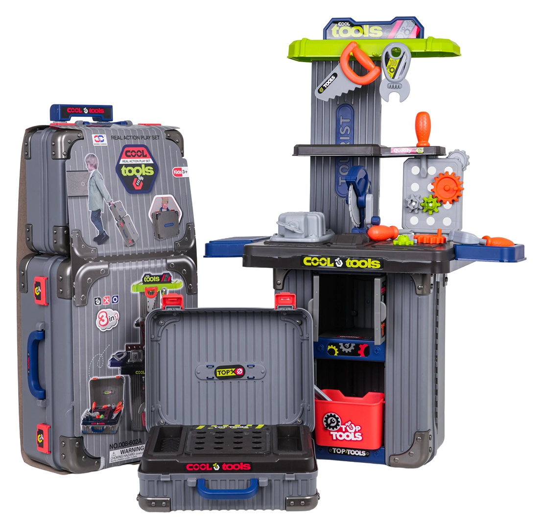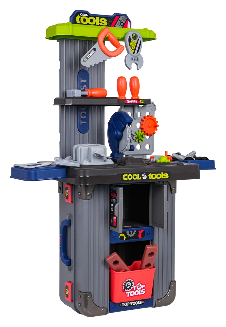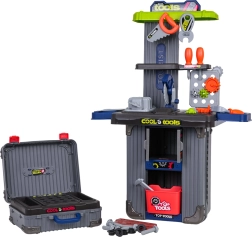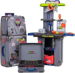 Bærbart 3-i-1 værkstedsæt til børn, som forvandles fra kufferter til en stabil arbejdsbænk. Tilbyder rigt tilbehør, robust plastkonstruktion og uendelige muligheder for kreativ leg for børn fra 3 år. I sættet finder du skruestik, sav, skruer, skruetrækkere, nøgler, tandhjul og andre dele – alt overskueligt opbevaret i praktiske kufferter med hjul.