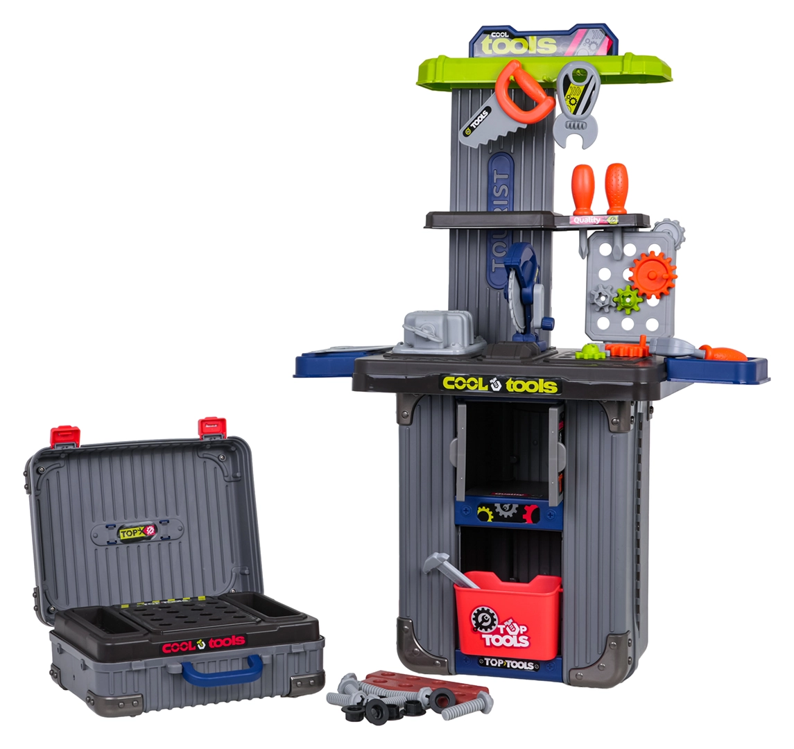 Dette smarte 3-i-1 sæt kombinerer to kufferter og et rigt udvalg af værktøj til én bærbar arbejdsverden. Børn samler nemt deres egen arbejdsbænk med skruestik, hylder og hulplade, og efter legen lægges alt tilbage i de mobile kufferter. Kvalitetsplast tåler intensiv brug og sikrer lang levetid.