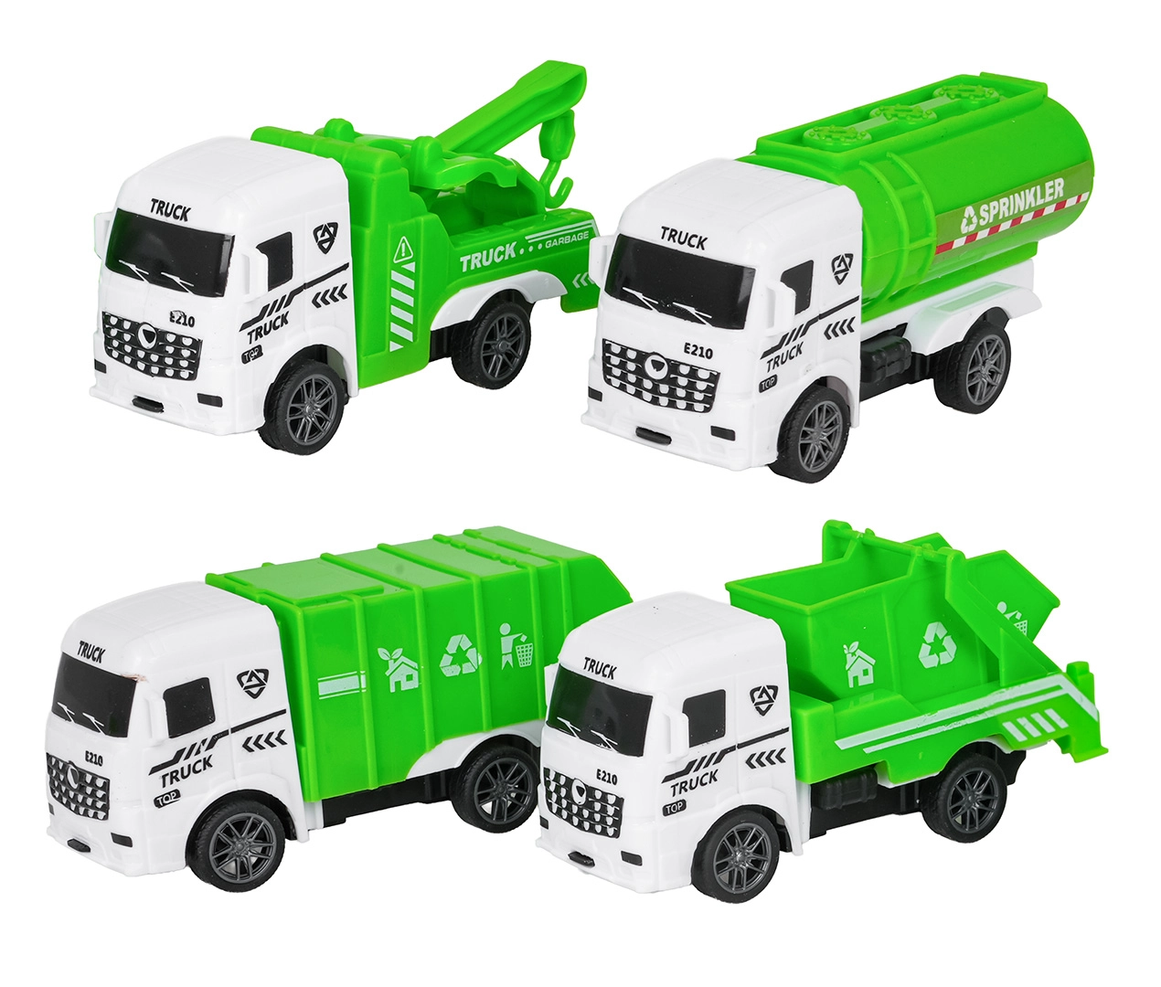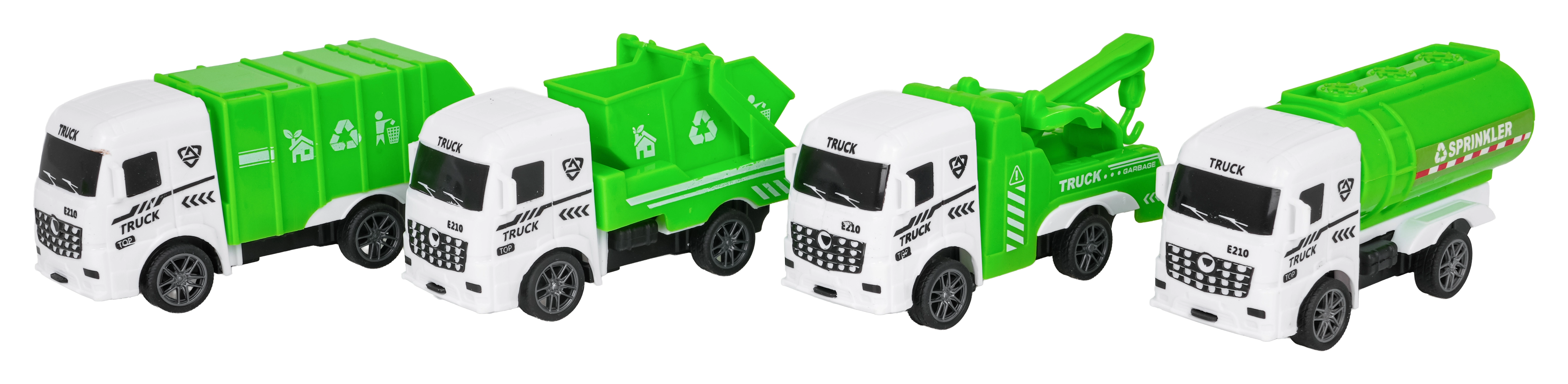 Skraldevogn, tipvogn, autohjælp og tankvogn/sprinkler – et komplet team til rengøring, vedligeholdelse og redning i byens gader.