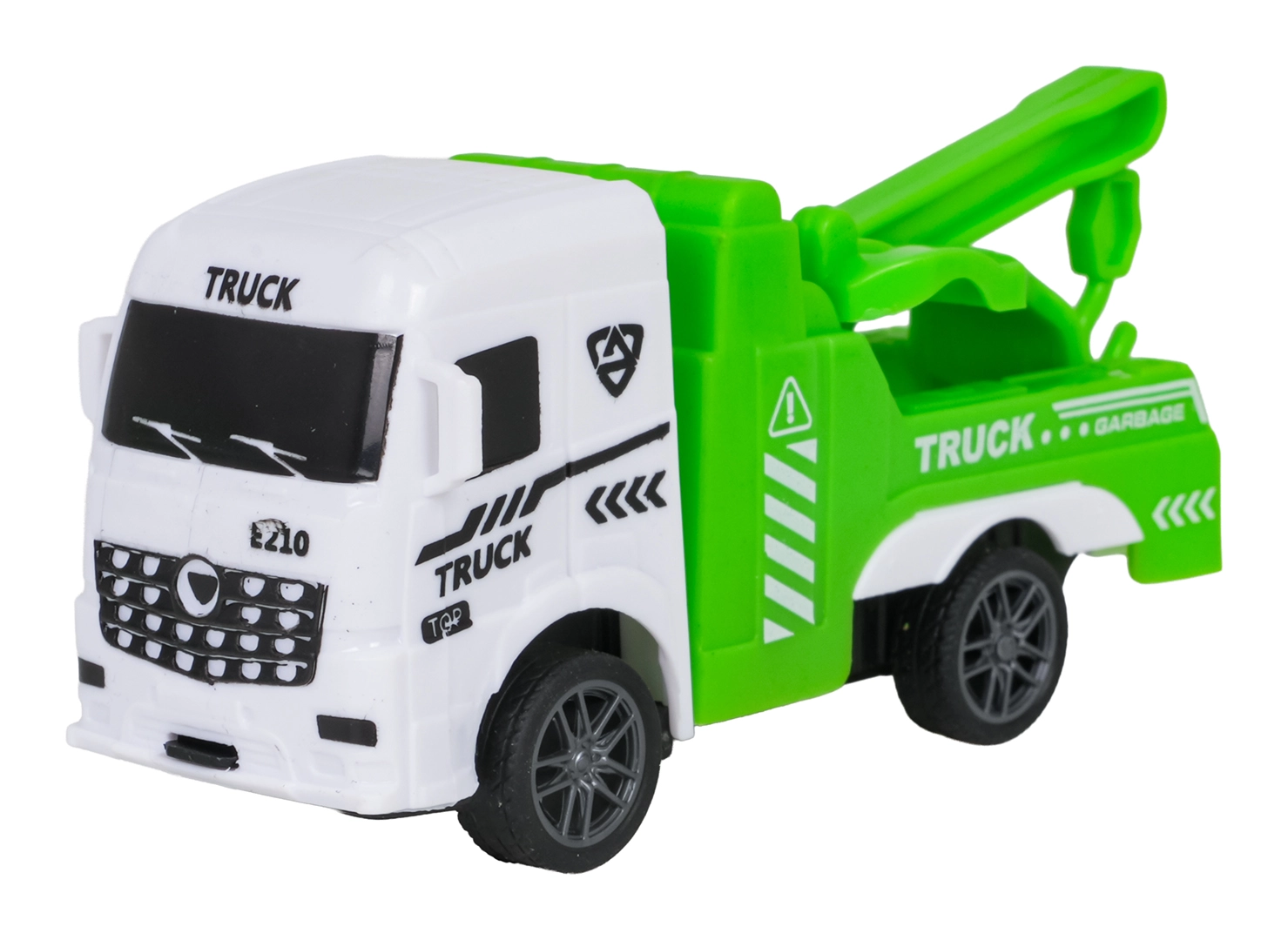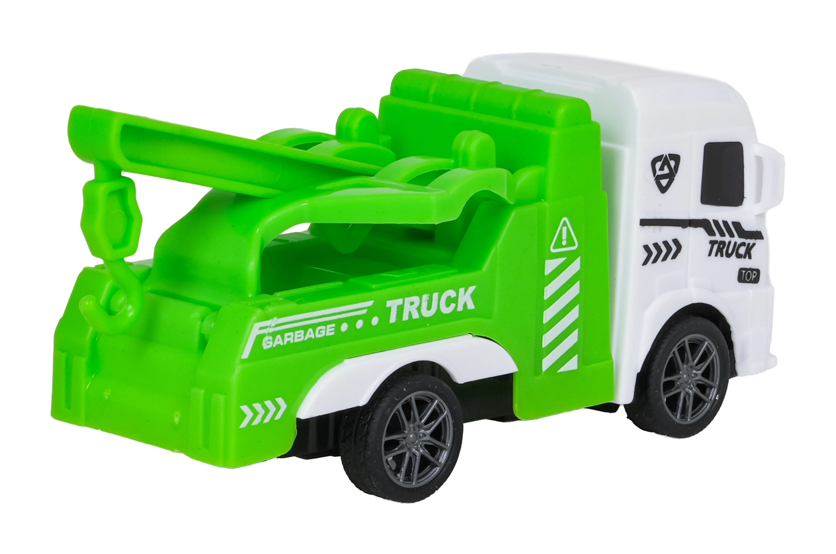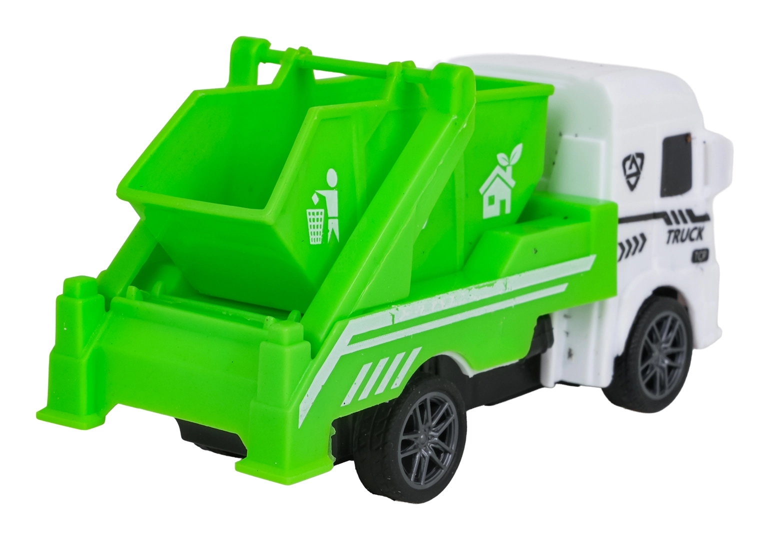 Åbent låg på skraldevognen, tippende lad, bevægelig autohjælpsarm og realistisk tankvogn understøtter fantasifuld leg.