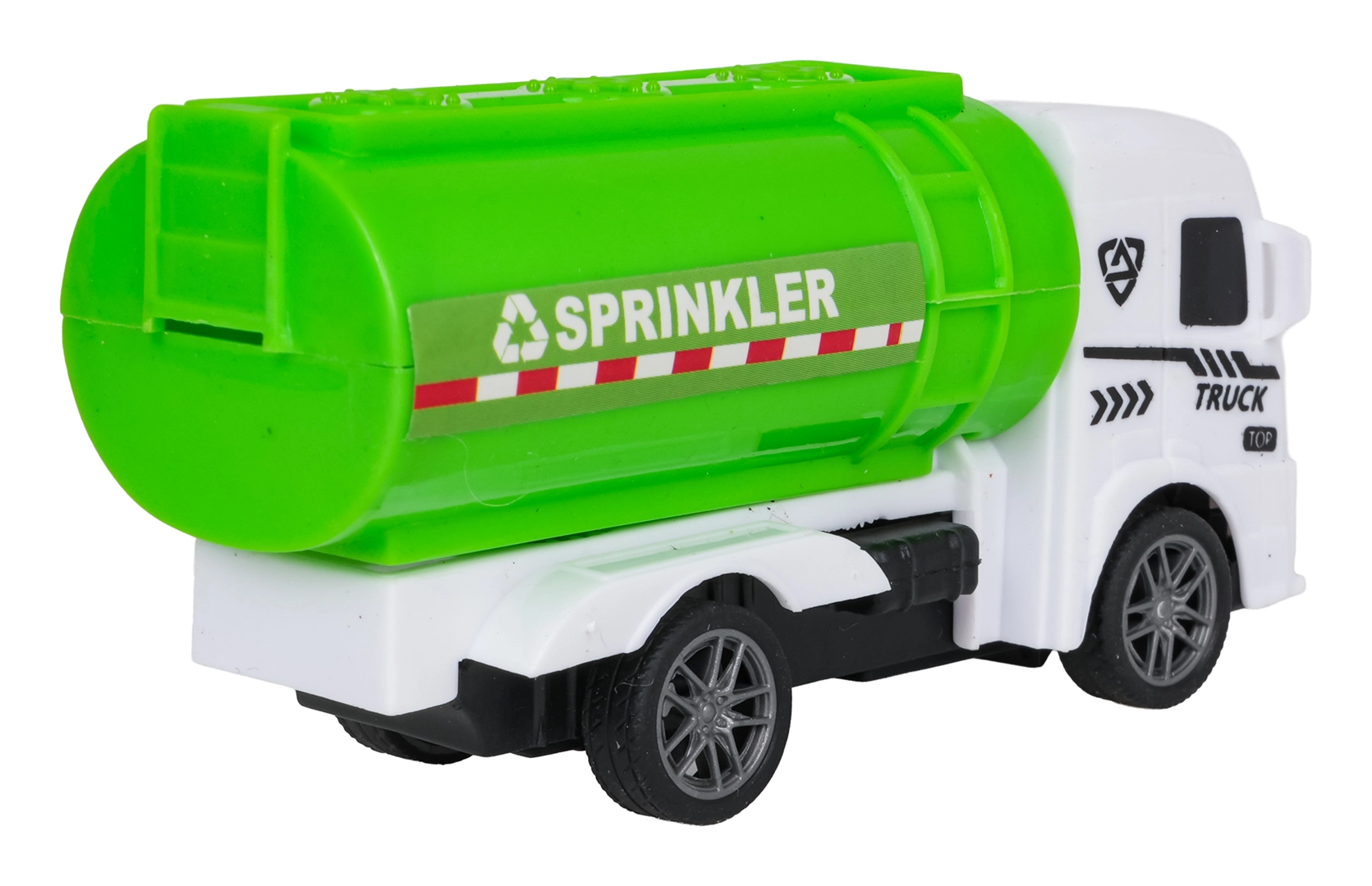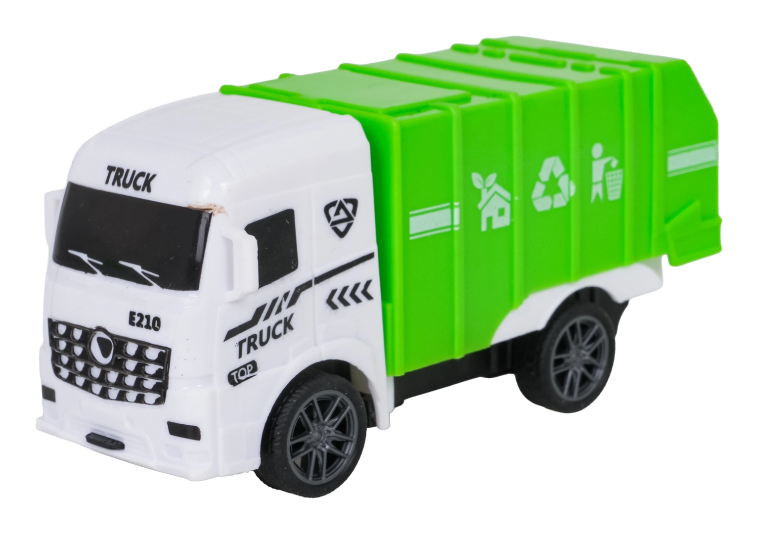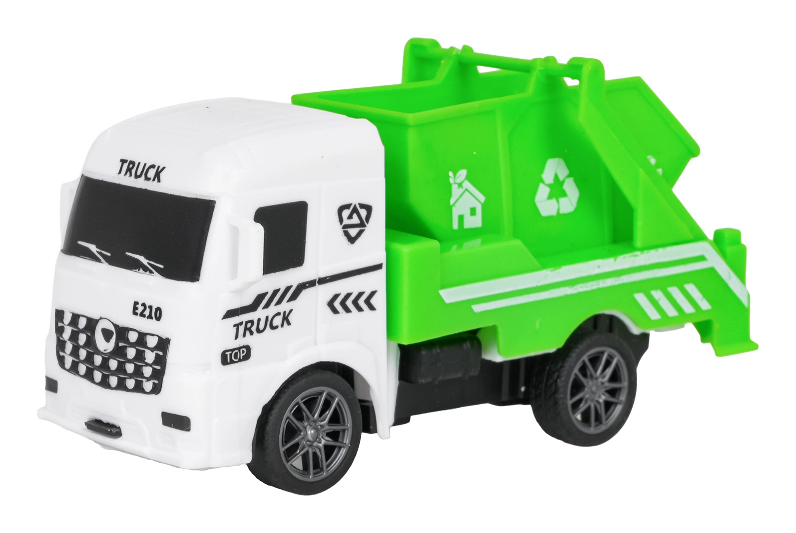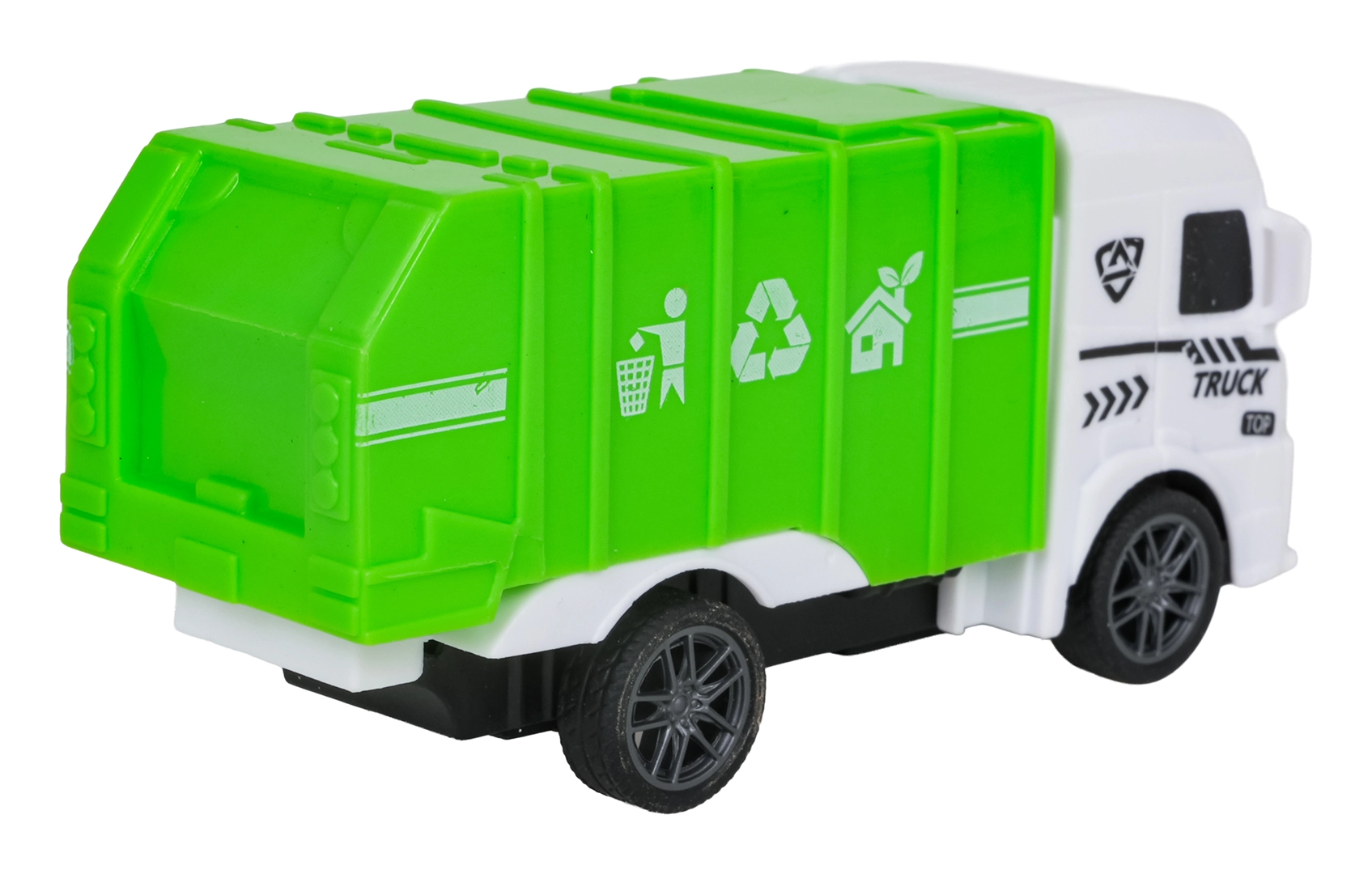 Åbent låg på skraldevognen, tippende lad, bevægelig autohjælpsarm og realistisk tankvogn understøtter fantasifuld leg.