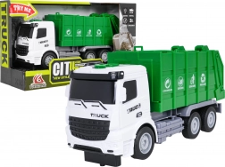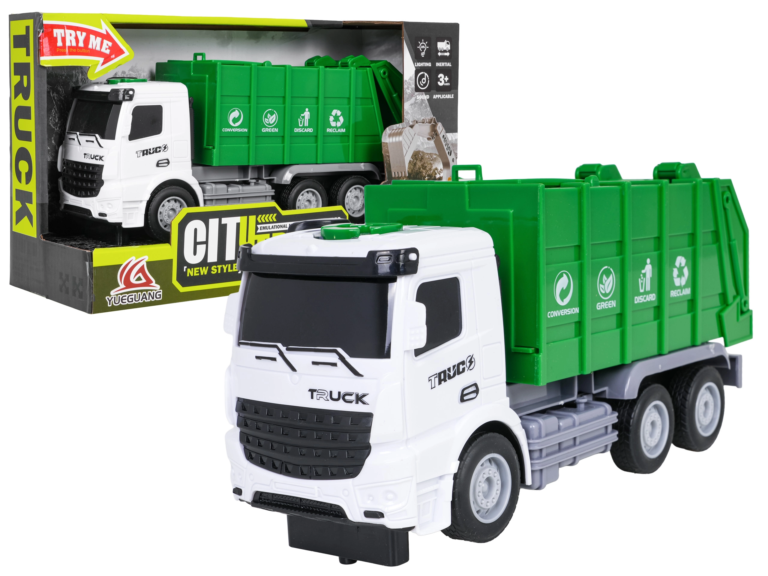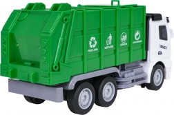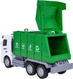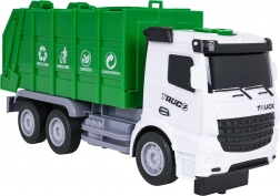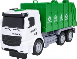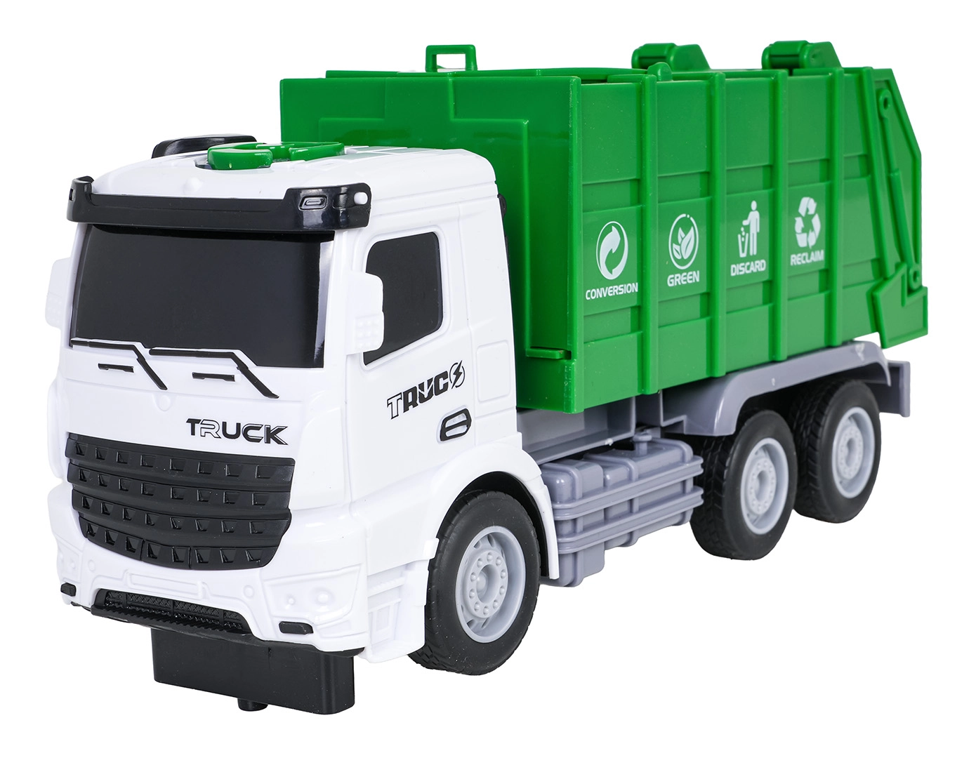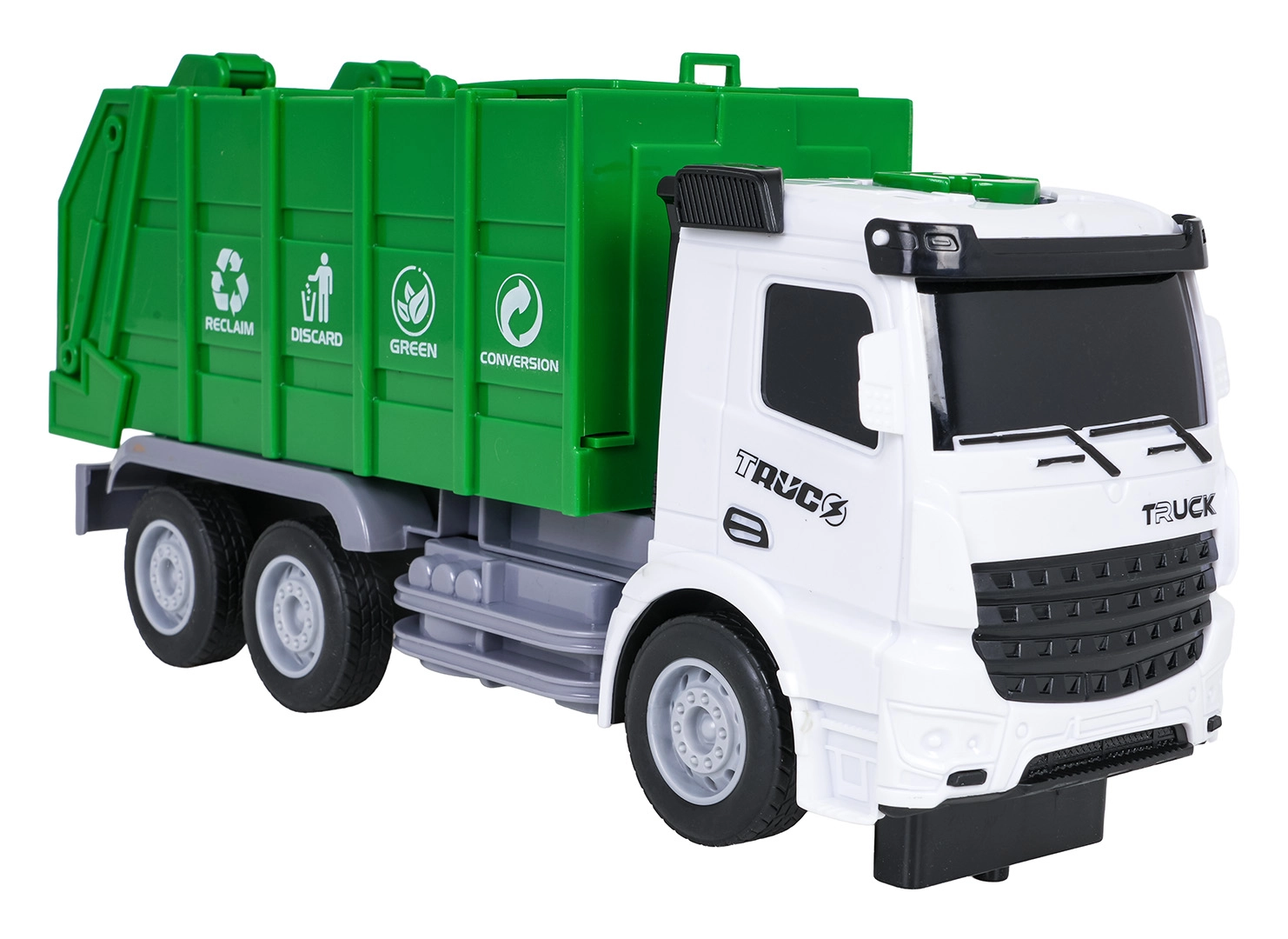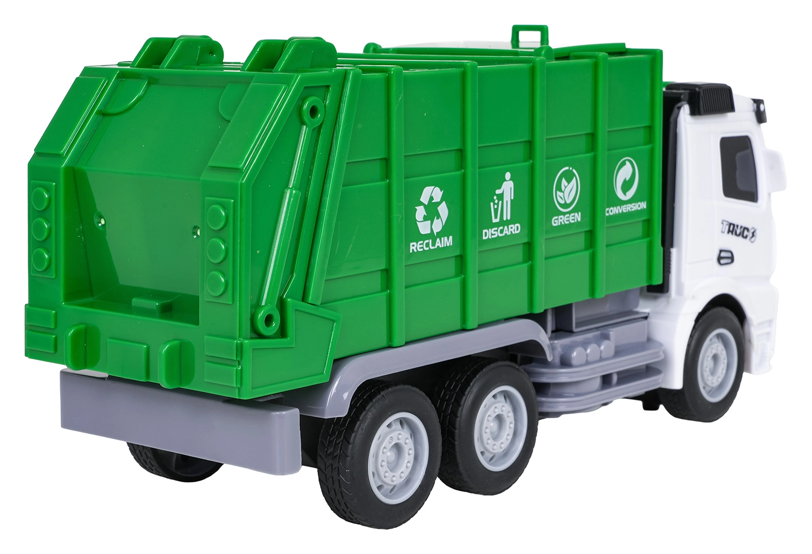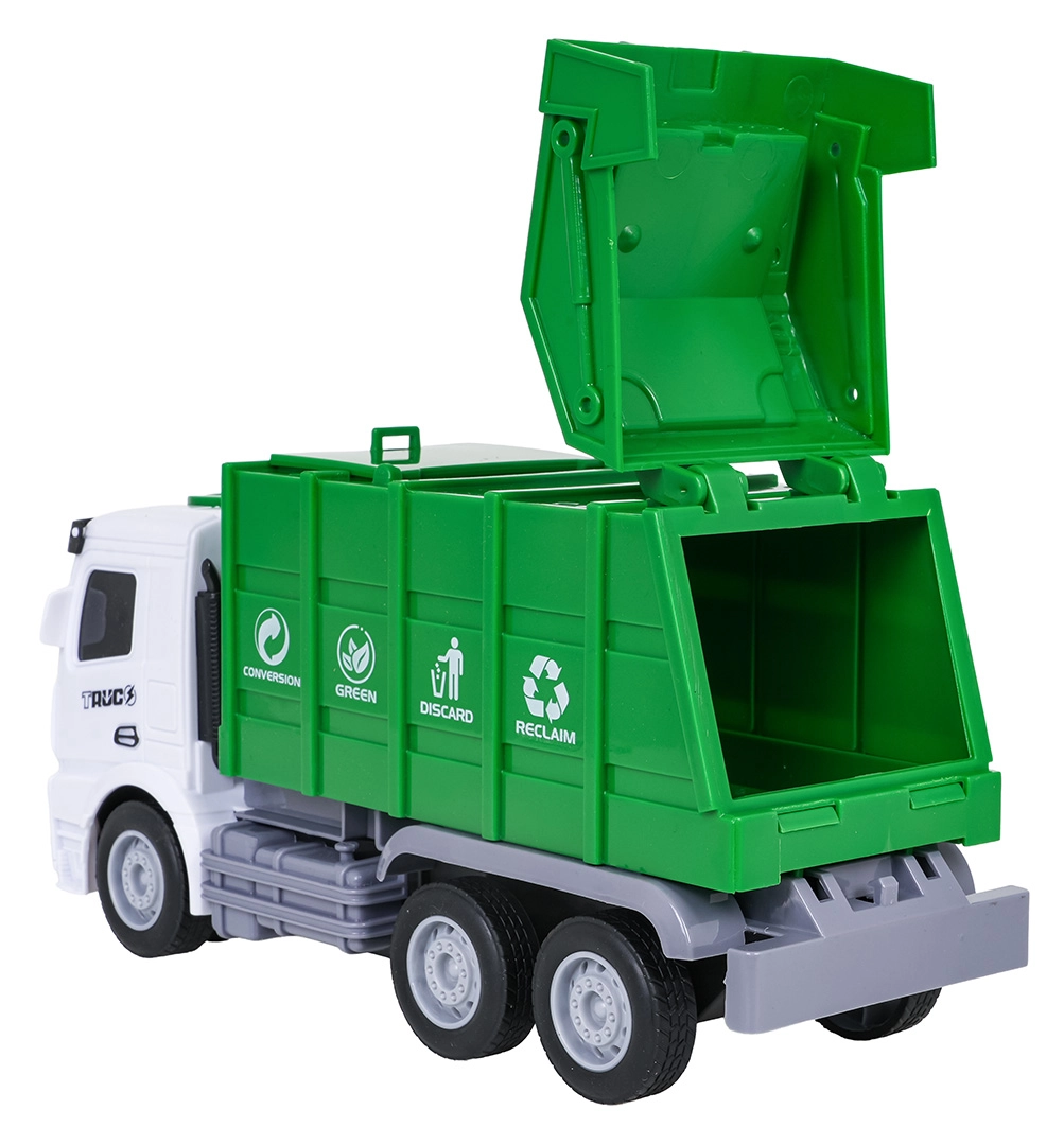 Denne realistiske skraldebil glæder enhver lille fan af arbejdsmaskiner. Den robuste konstruktion, sans for detaljer og gummidæk sikrer en glat og dynamisk kørsel på forskellige underlag. På tagets kabine finder du et betjeningspanel, der aktiverer lyde af start, kørsel, bakning samt en energisk melodi, ledsaget af blinkende lys.