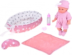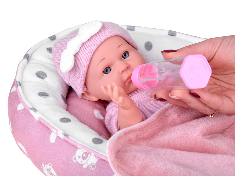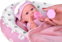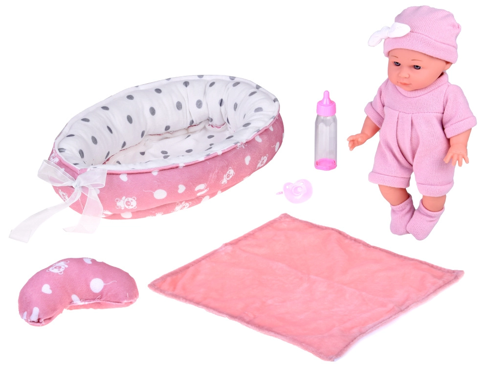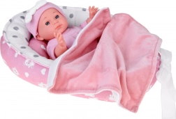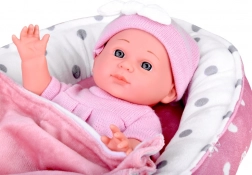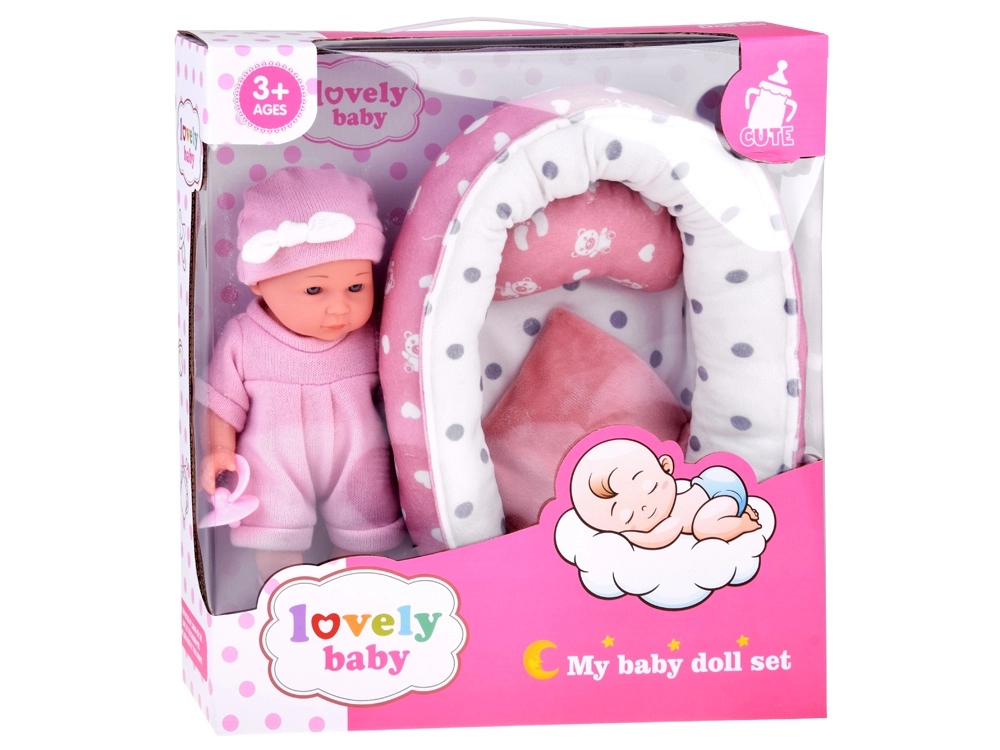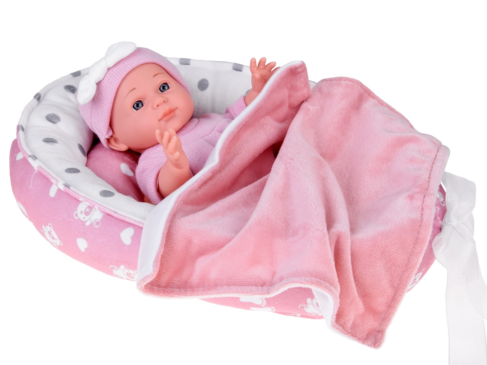 Denne babydukke er designet til blide omsorgslege. Takket være realistiske ansigtsdetaljer, det bløde lyserøde sæt og bevægelige arme og ben får børn timevis af kreativ underholdning. Den bløde tekstilrede med pude og tæppe giver babyen et behageligt sted at sove.