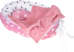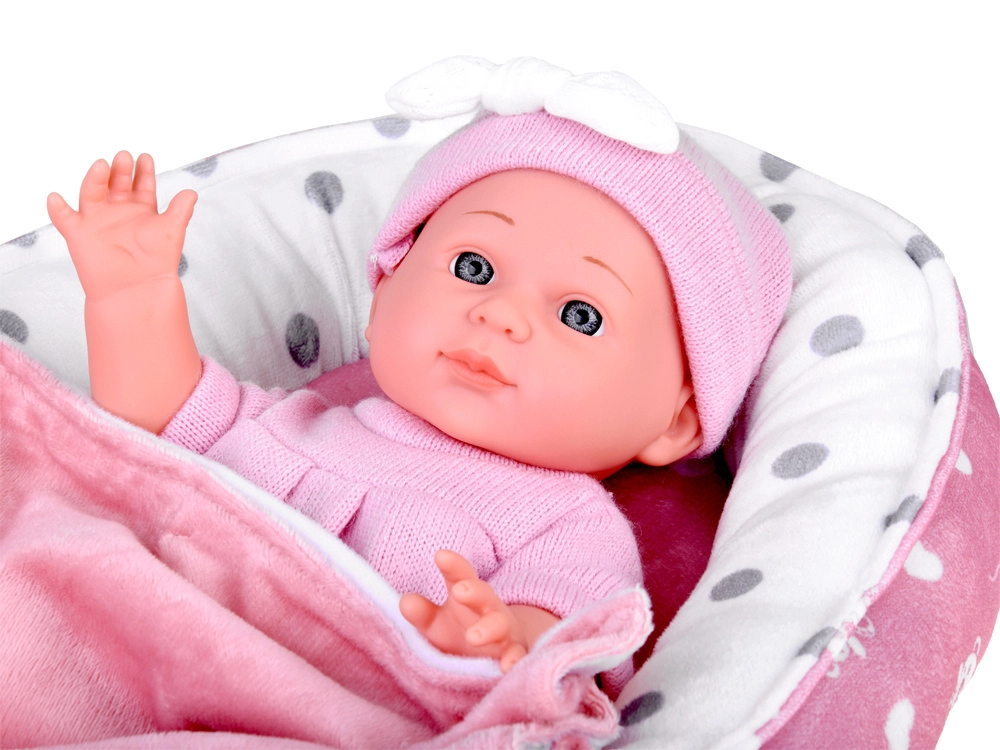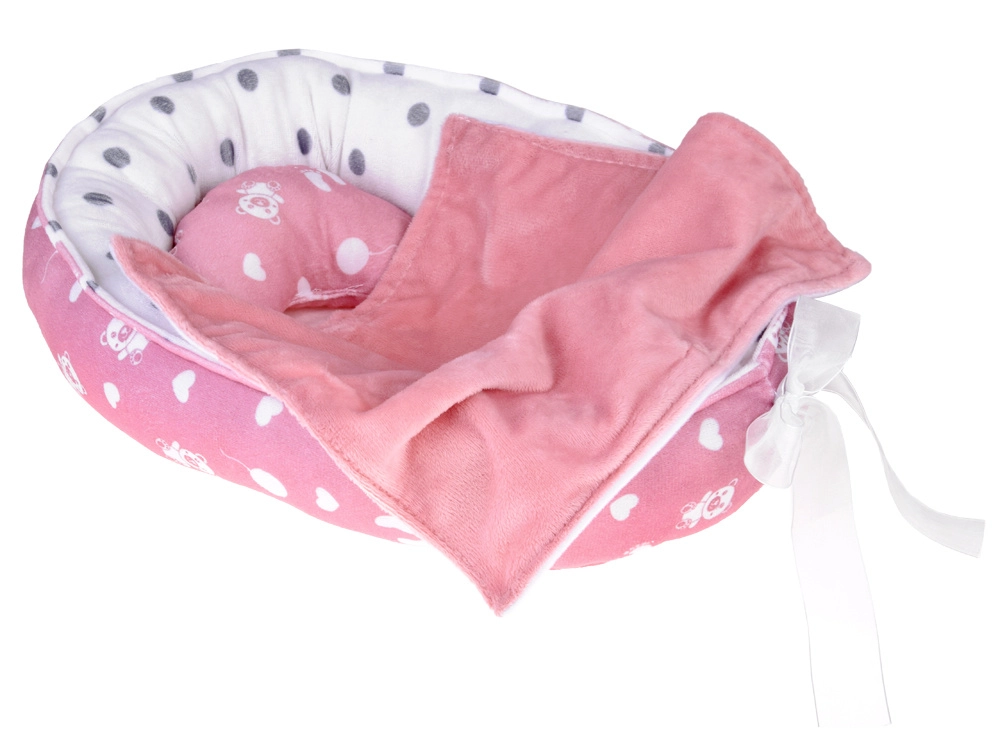 Tekstilvugge med prikket foer og sløjfe giver dukken et hyggeligt sted. Børn kan nemt bære den og lægge babyen til at sove når som helst og hvor som helst.