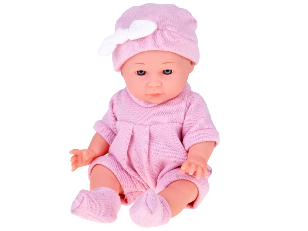 Dukken har et detaljeret ansigt, bevægelige lemmer og en sød hue med lille sløjfe. Tøjet er aftageligt og behageligt at røre ved.
