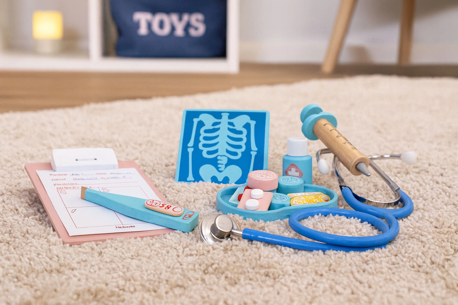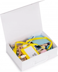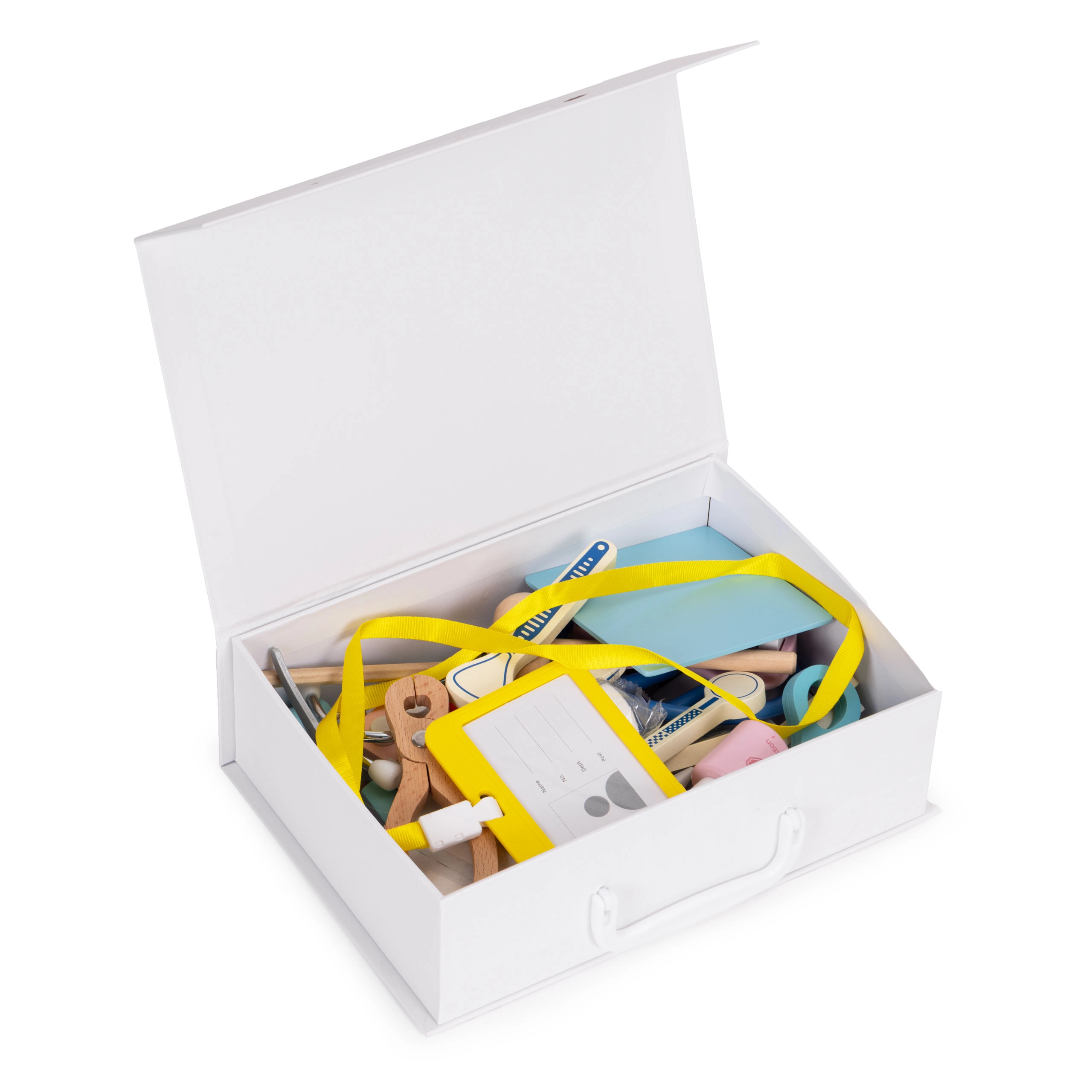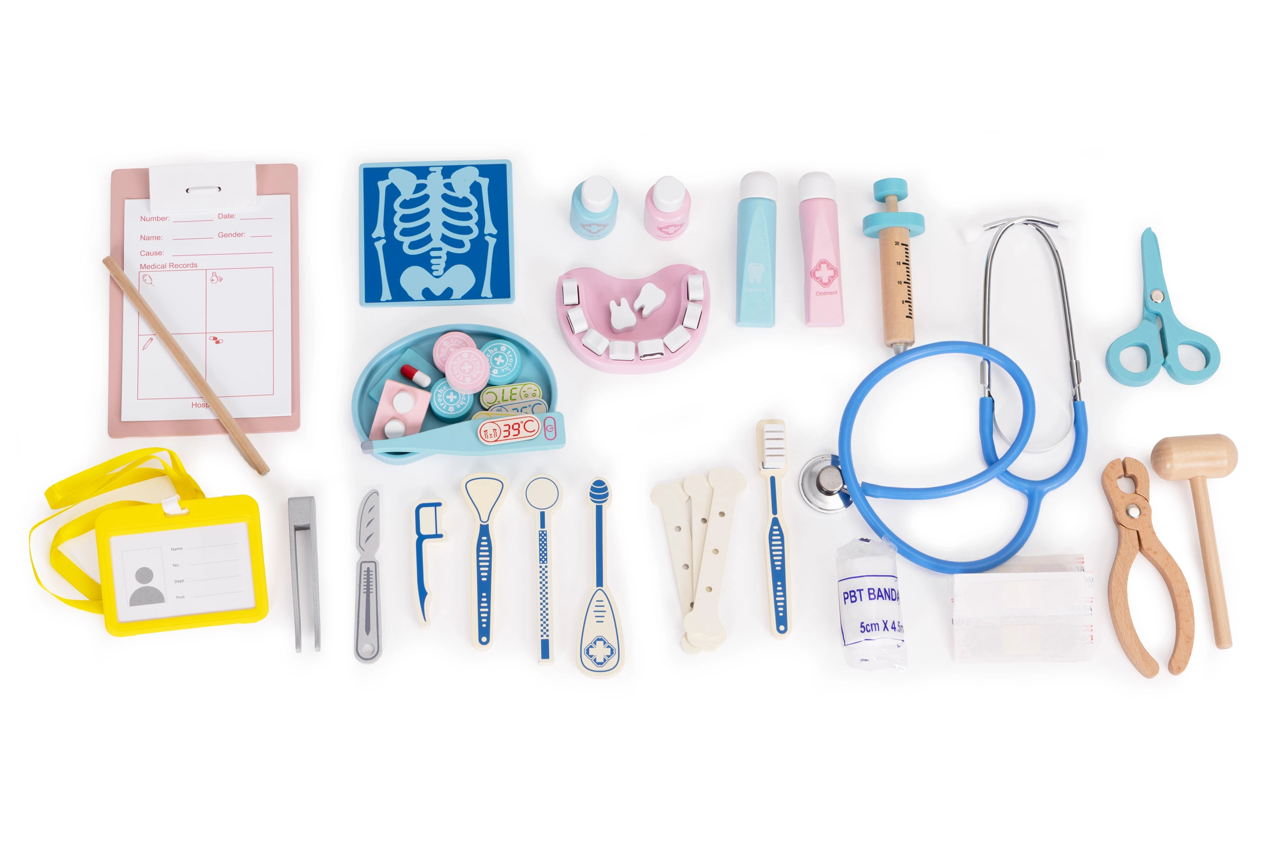 Alle komponenter er fremstillet af holdbart træ i behagelige pastelfarver og opbevaret i en solid kuffert for nem transport og orden. Takket være det realistiske design lærer børn at tage sig af andre, udvikler fantasi og hånd-øje-koordination.