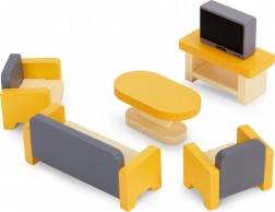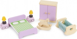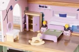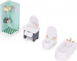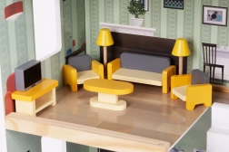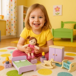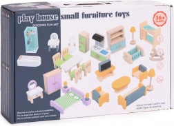 Den praktiske sammensætning til hele dukkehuset omfatter udstyr til stue, badeværelse, soveværelse, køkken og spisestue. Delene er tilpasset mindre dukker og passer også i små rum – og fungerer lige så godt som et selvstændigt sæt til fri leg.