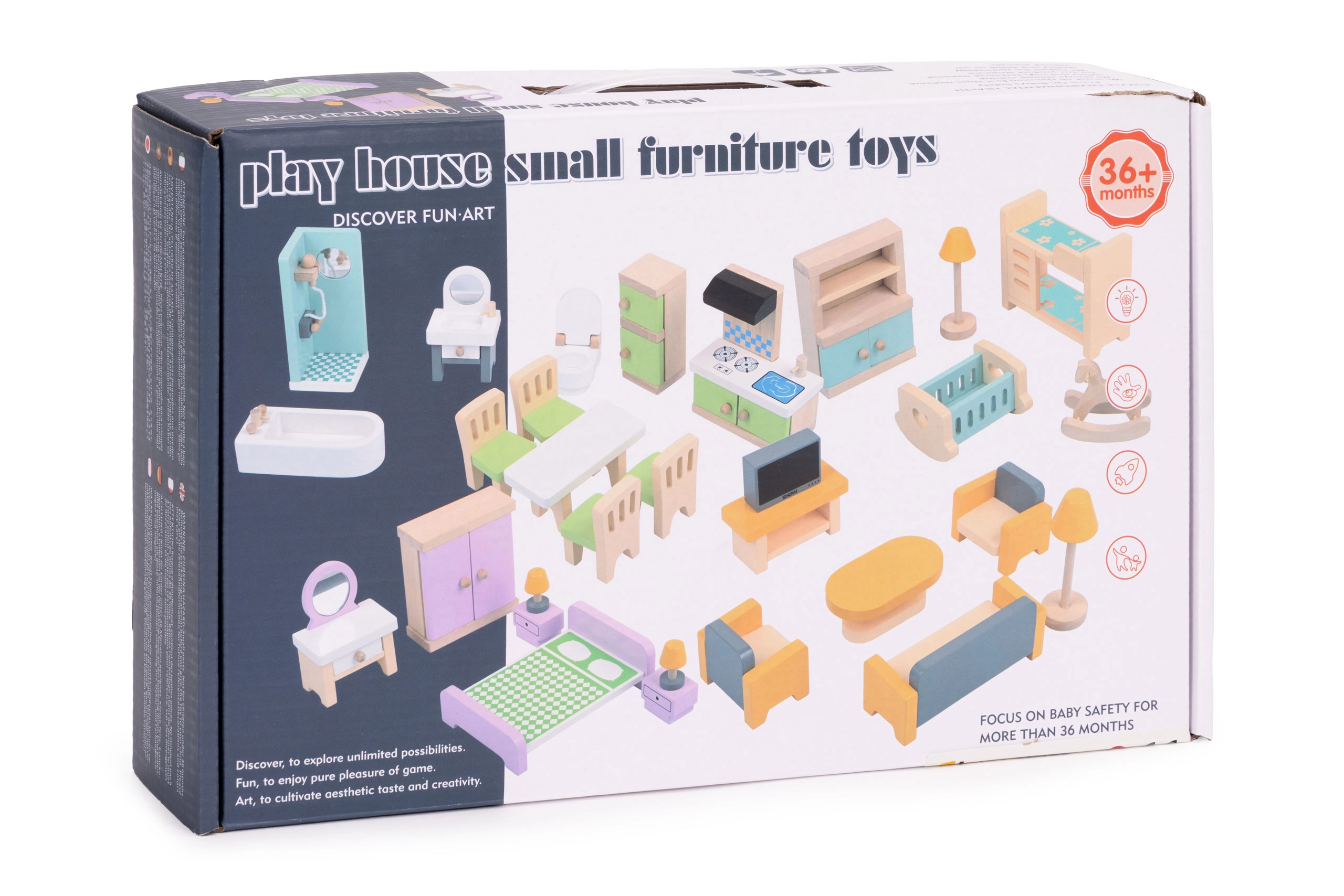 I sættet finder du møbler til stue, soveværelse, køkken, badeværelse og spisestue – i alt 30 dele til uendelig indretning og legescenarier.