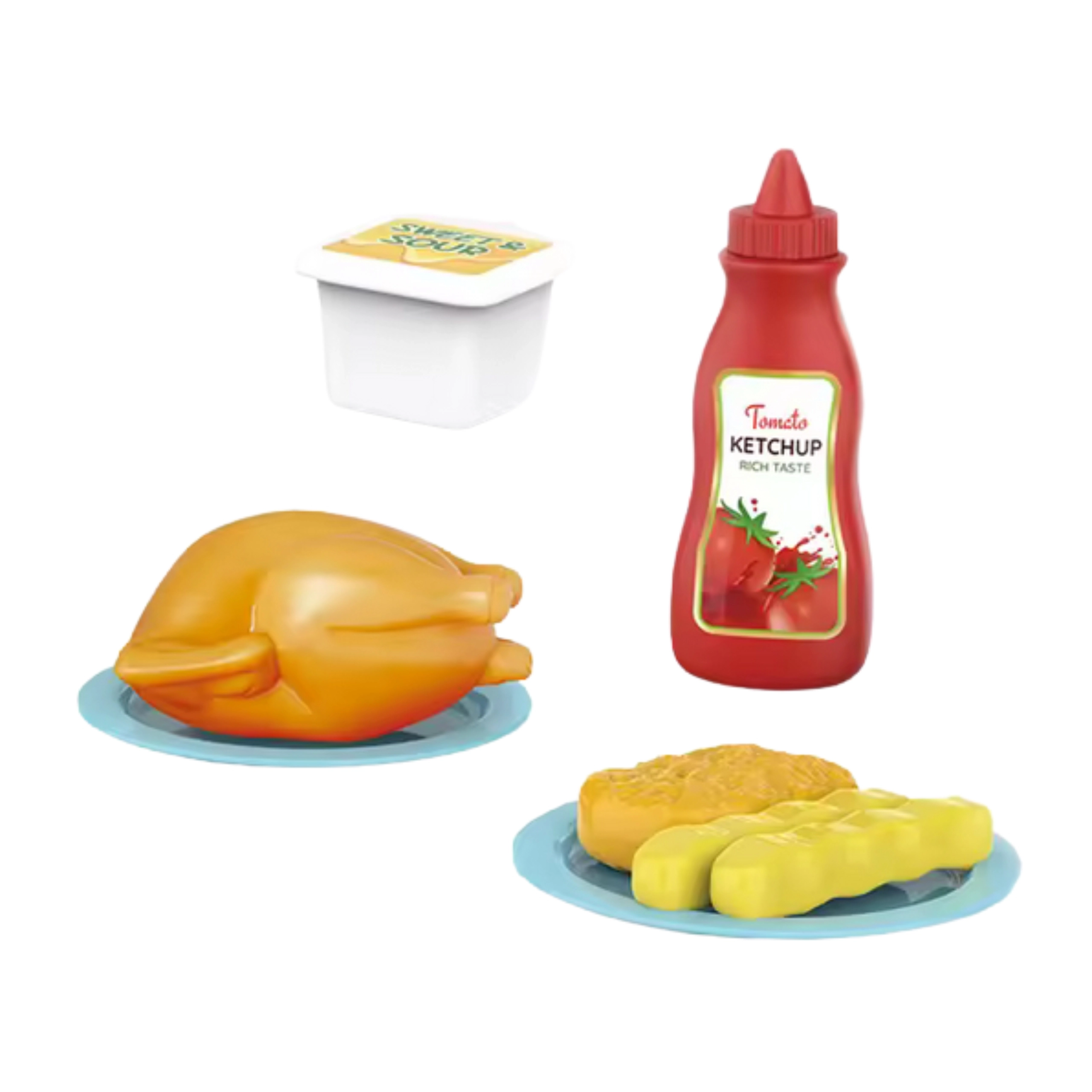 Æskens indhold: interaktiv mikrobølgeovn, plastkylling, 2× pommes frites, 1× nugget, bæger med sauce, ketchupflaske, 2 tallerkener.