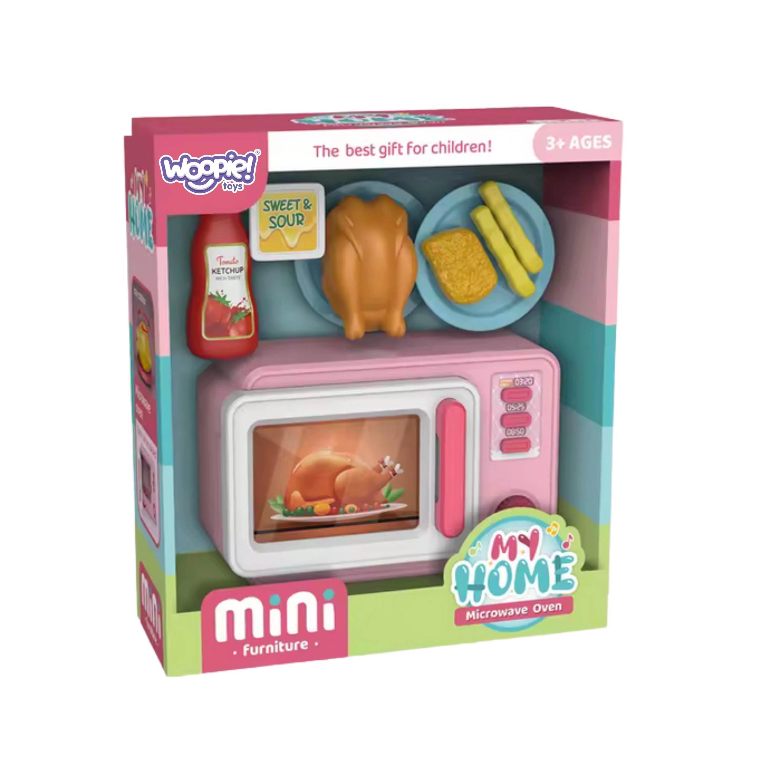Denne interaktive mikrobølgeovn er designet til troværdigt at efterligne rigtige husholdningsapparater – med oplyst indre, realistiske lyde og en roterende tallerken. Børn kan indstille tid, åbne lågen, lægge kylling, pommes frites eller nugget i og se, hvordan mikrobølgeovnen “arbejder”. Et fremragende valg til lærerig leg og træning af daglige rutiner.