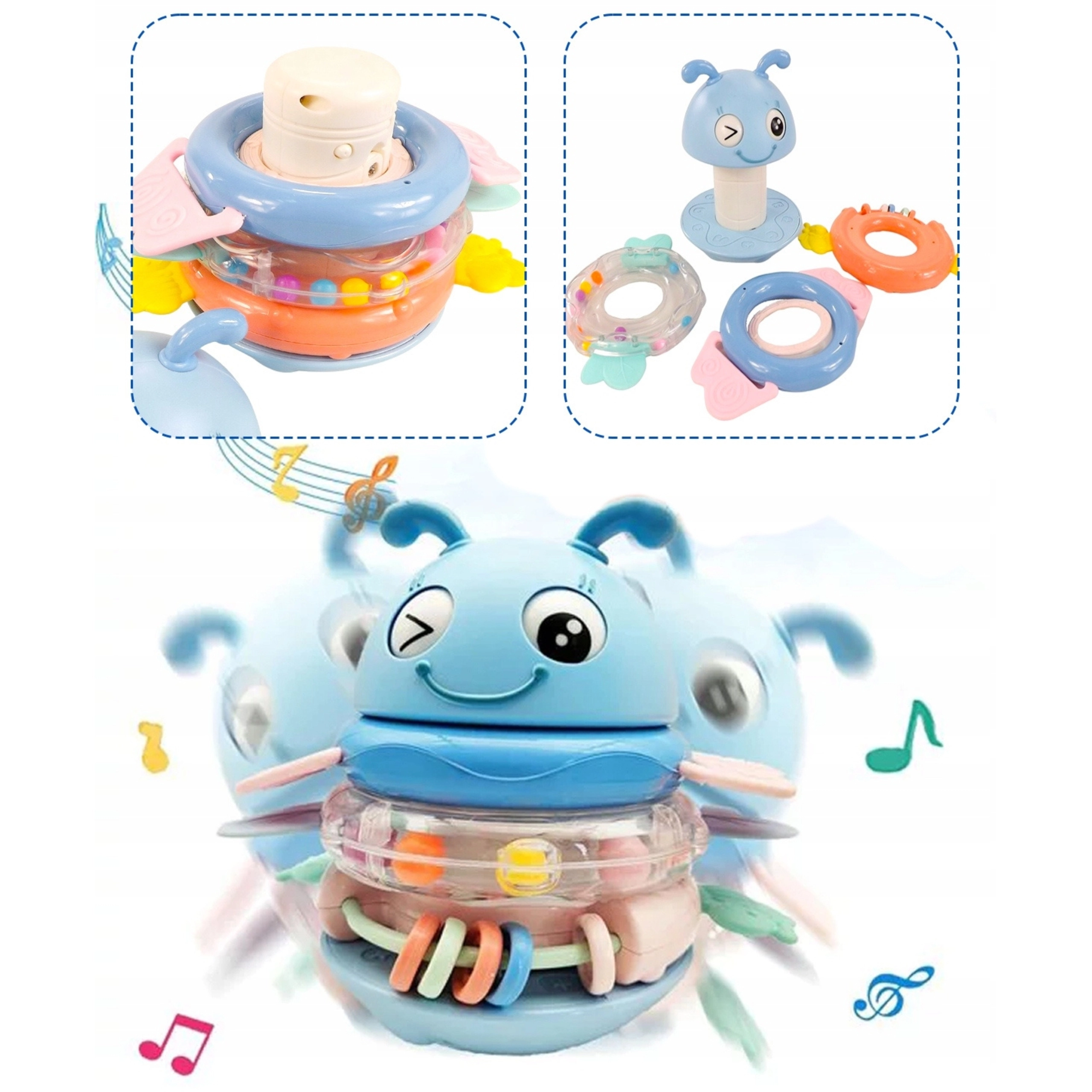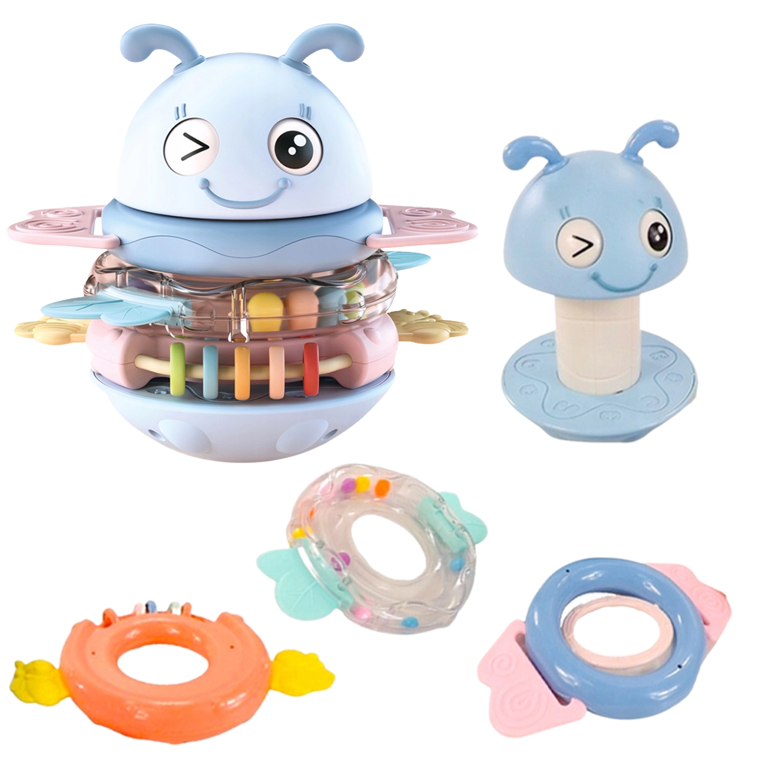 Multifunktionelt sanselegetøj 2-i-1 fra Woopie kombinerer rangle og bidering i ét. Tre farvede ringe med bløde silikoneknopper kan sættes på stativet, som ved hver påsætning afspiller en melodi eller en sjov lyd. Sikkert, afrundet design, varierede teksturer til sanseudvikling og en stabil vuggende base understøtter finmotorik, nysgerrighed og selvstændig leg fra de første måneder.
