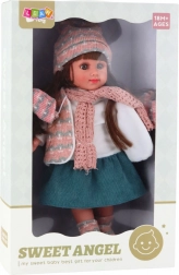 Den søde dukke SWEET ANGEL med en højde på 36 cm vil glæde hvert barn, der elsker at lege familie og passe på andre. Hun har langt brunt hår, fine ansigtstræk og realistiske øjne. Hun er klædt i et vintersæt – hue, halstørklæde og cardigan, suppleret med nederdel, bluse og sokker. Perfekt til at udvikle fantasien og rolleleg.