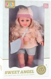 - Dukke Sweet Angel 36 cm i pastelfarvet tøj med håndtaske og striktrøje med svamp; original emballage