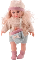 Den søde dukke Sweet Angel med en højde på 36 cm imponerer med detaljeret udførelse og et blidt udtryk. Hun har langt blondt hår, realistiske ansigtstræk og et moderne outfit i pastelfarver: strikket trøje med svampemotiv, korte blå shorts, lyserøde sokker, cremefarvet hue og håndtaske med sløjfe. Perfekt til rolleleg, udvikling af fantasi og som samlerobjekt.