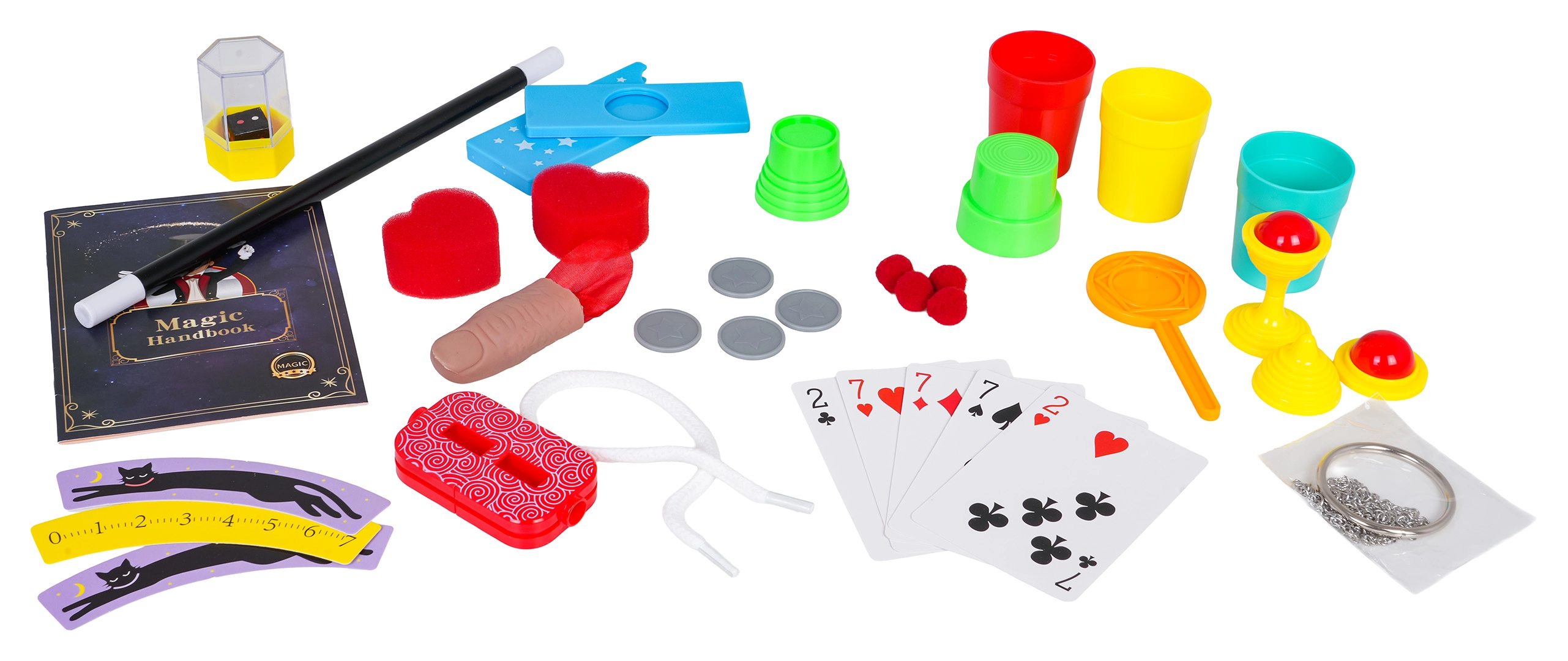 I pakken finder du et varieret udvalg af tryllerekvisitter – fra tryllestav, bægre og mønter til specialrekvisitter, der hjælper med at styre publikums opmærksomhed. Hvert trick er tydeligt forklaret og tilpasset børn, så de kan nyde succes og opbygge selvtillid.