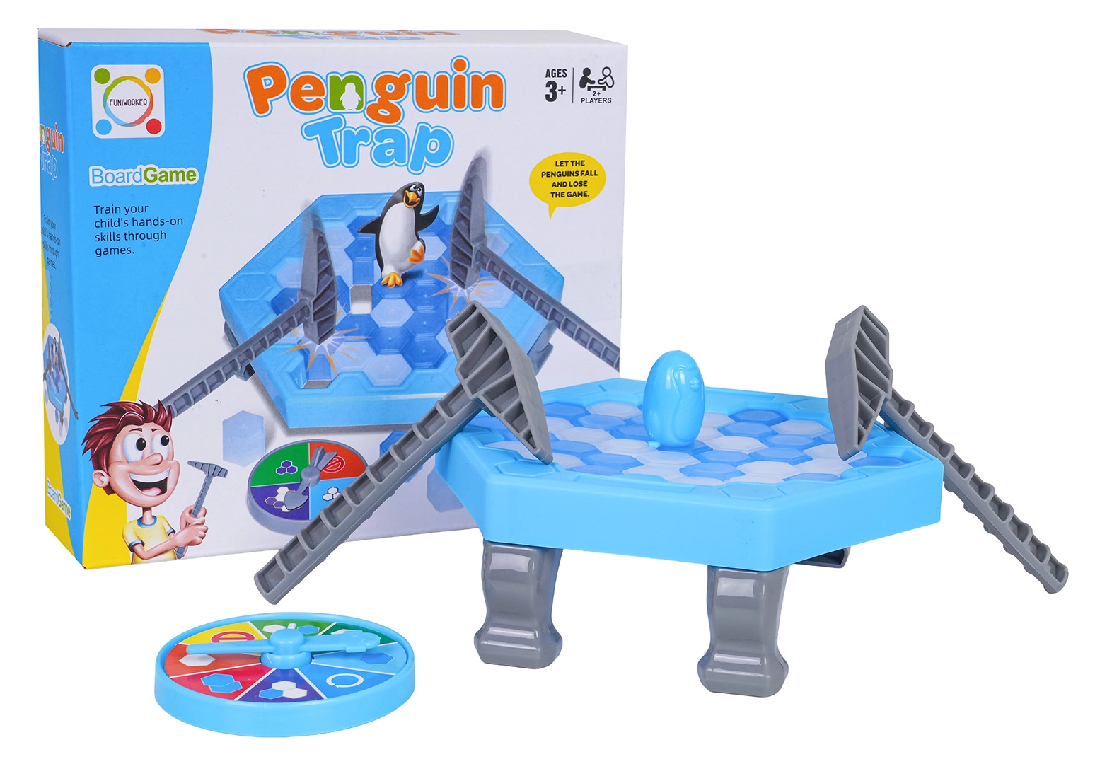 Pingvin på isen er et fængende færdighedsspil for både små og store. På en sekskantet, frostkold bane banker I skiftevis isbrikker ud med hamrene efter resultatet på spinneren. Den, der får pingvinen til at falde, taber – spændingen stiger for hvert træk!