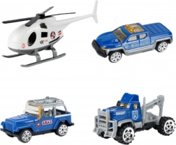 Sættet indeholder 3 metal politibiler (tilfældige modeller) og en politihelikopter, så børn kan lege både alene og med venner. Den robuste konstruktion i holdbar plast og de livlige farver sikrer sikker og attraktiv leg fra 3 år.