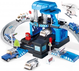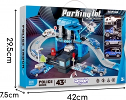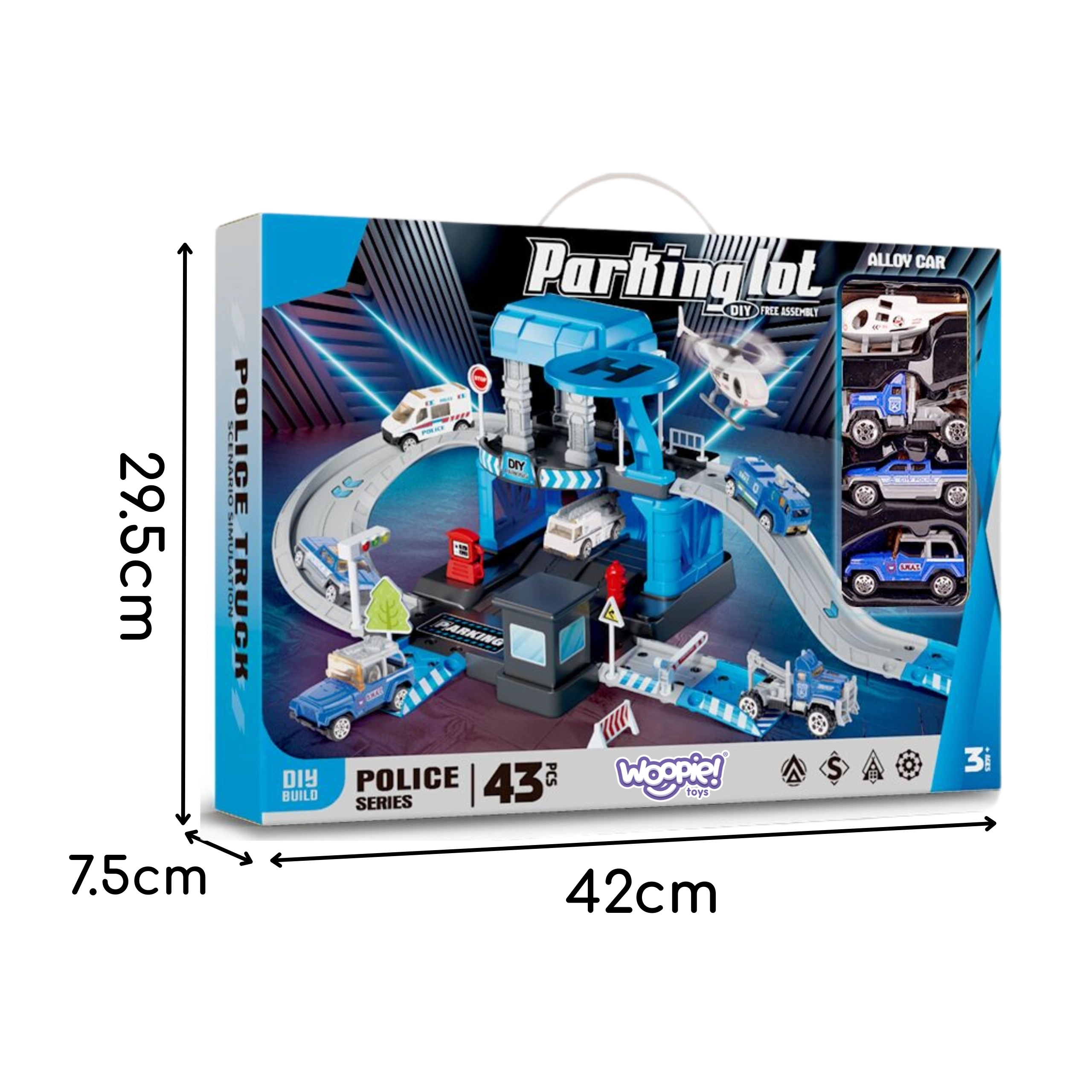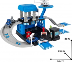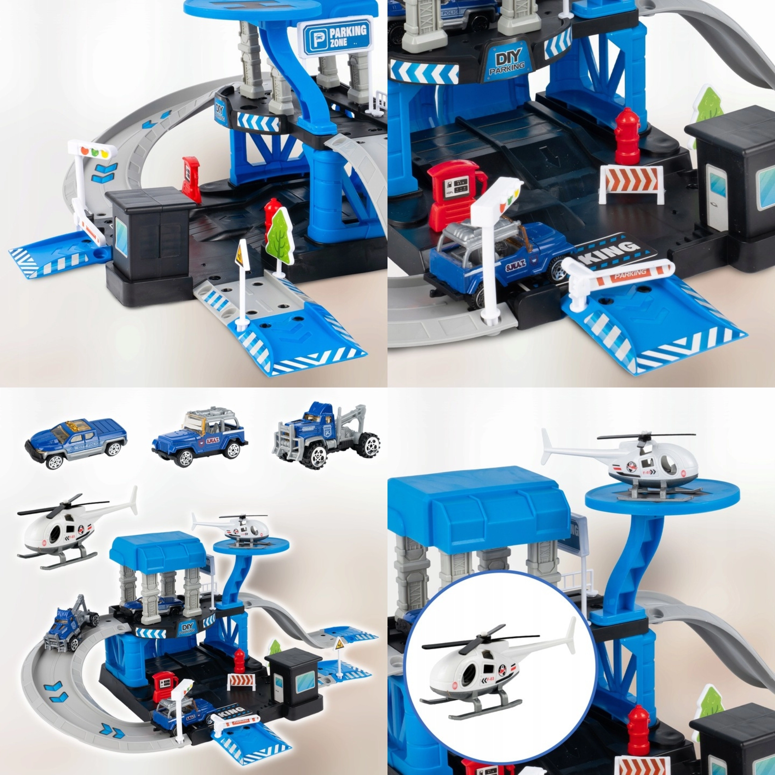 Skab din egen politiby! Dette to-etagers parkeringsanlæg med kommissariat byder på ramper, nedkørsler og en landingsplads til helikopter. Takket være de realistiske detaljer som tankstation, bomme, trafikskilte, trafiklys og vagtbod kan børnene let finde på utallige historier og missioner.