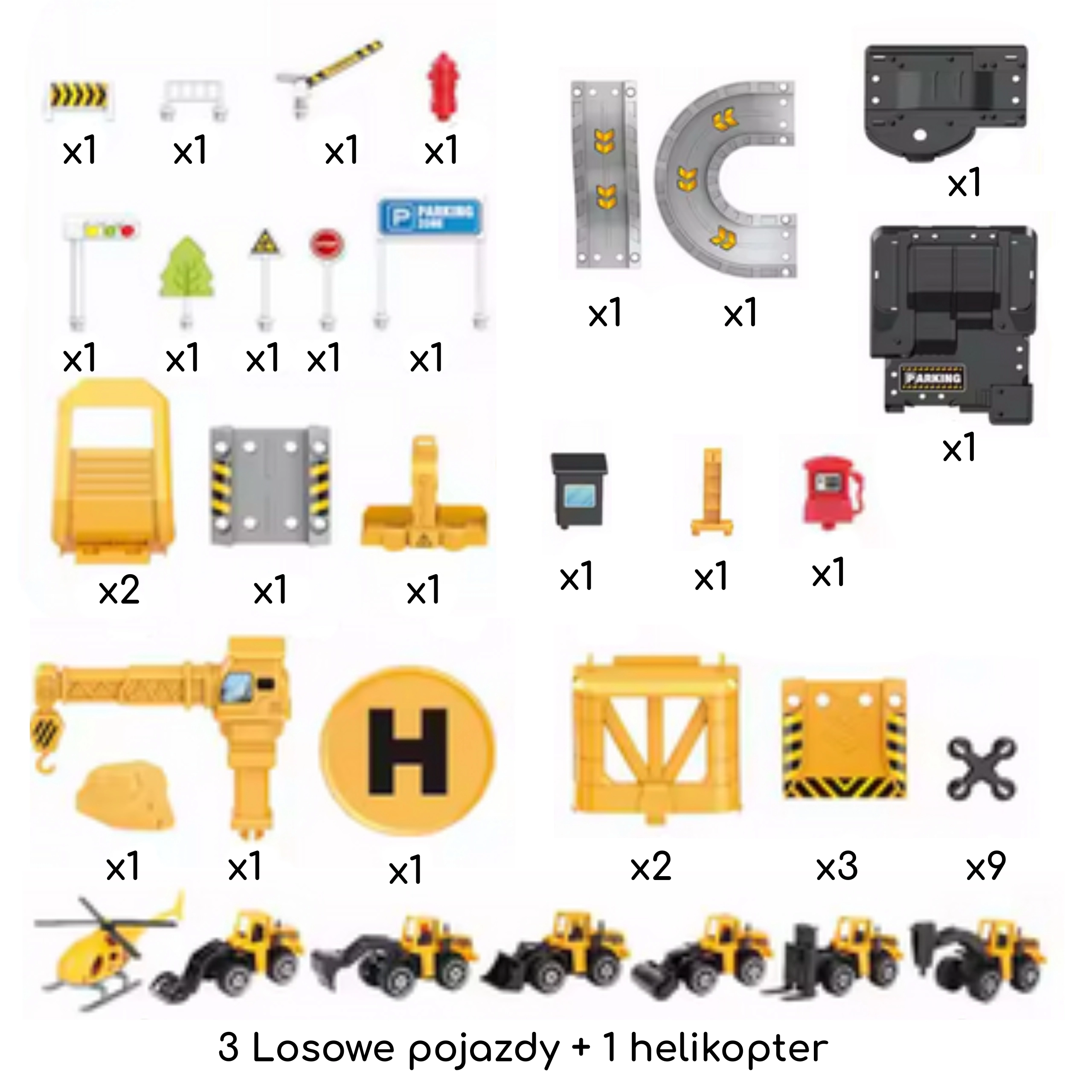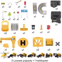 Sættet indeholder 41 dele, herunder 3 metalbyggebiler (tilfældige modeller) og en helikopter, så børn kan skabe deres egne scenarier og lege både alene og med venner. Robust plastkonstruktion og livlige farver sikrer sikker og attraktiv leg for børn fra 3 år.