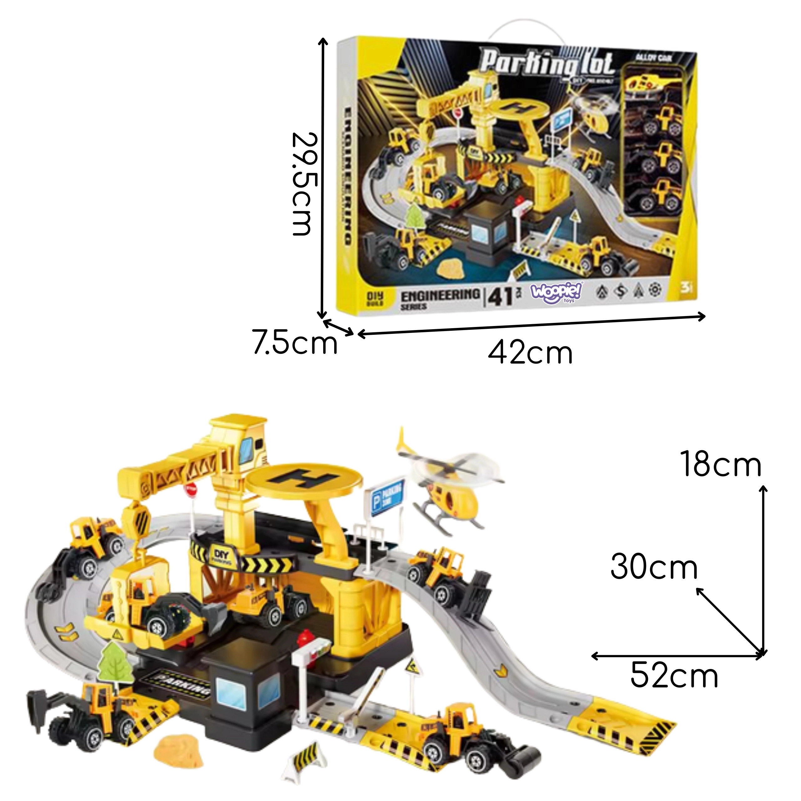 WOOPIE byggegarage er et to-niveaus parkeringshus med ramper, rutsjer og heliport, som med sine realistiske detaljer drager børn ind i byggeuniverset. Mekanisk betjent kran med elevatormekanisme, tankstation, bomme, trafiklys og vagtbod understøtter rolleleg og timevis af sjov.